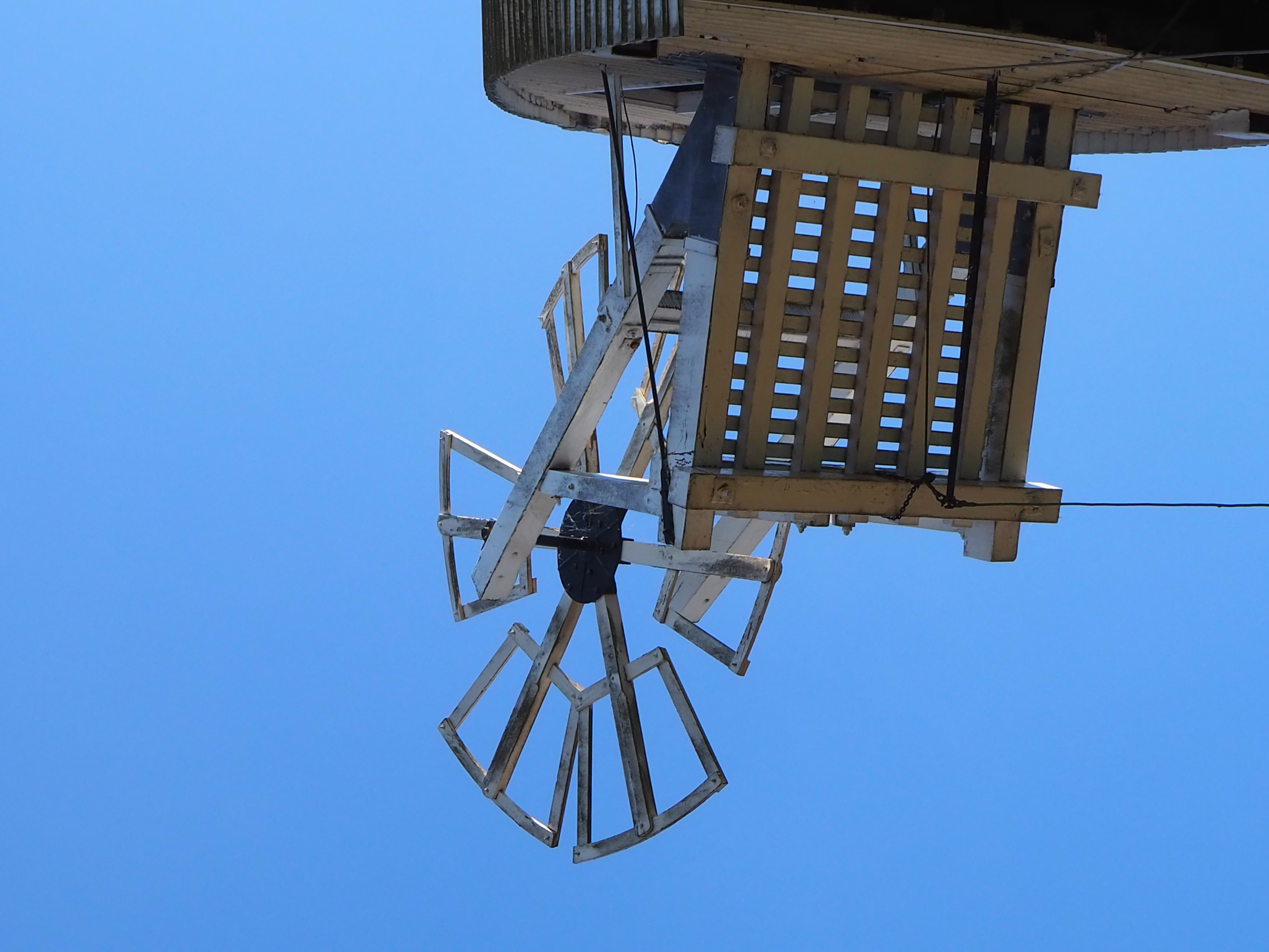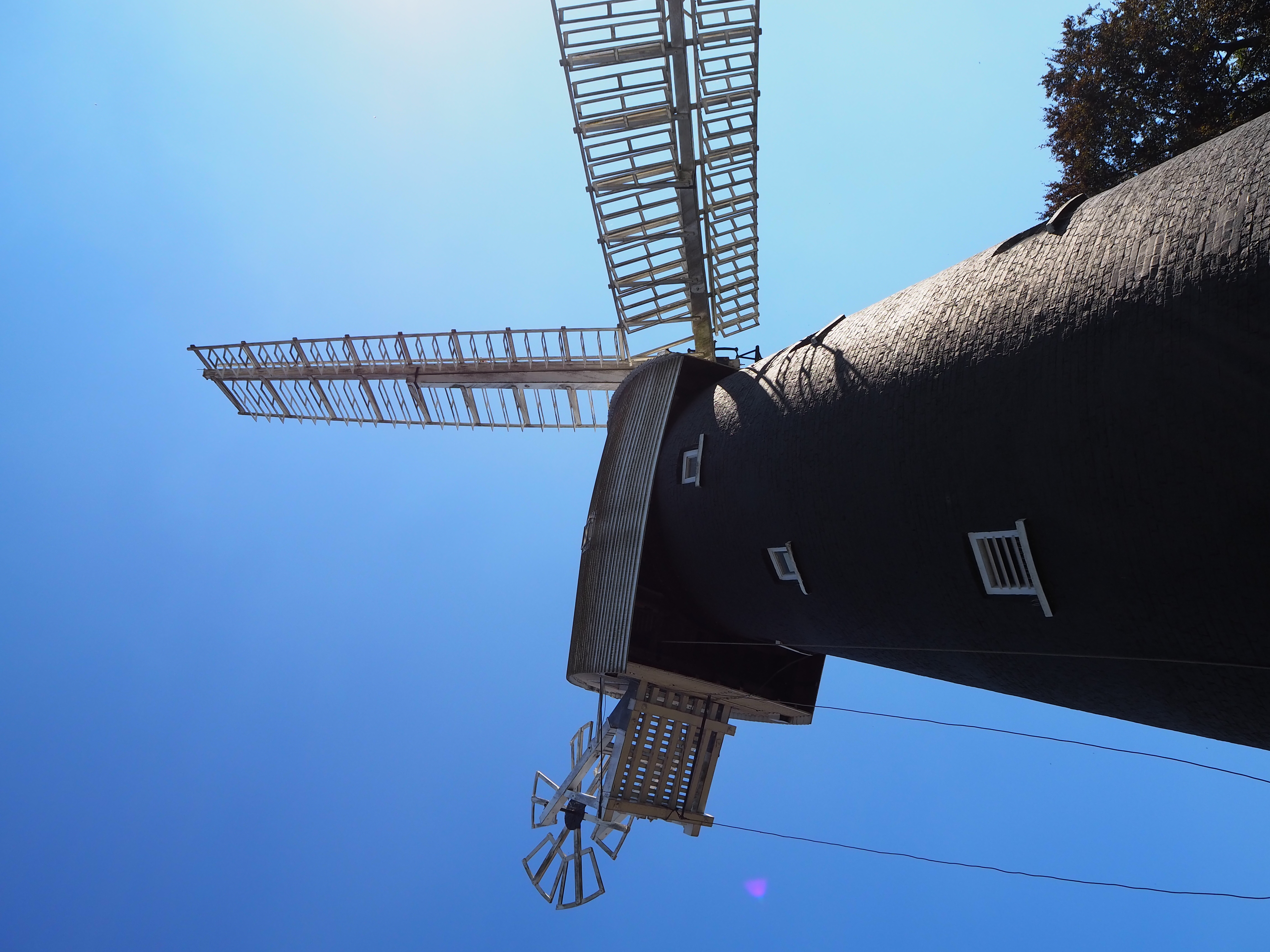 The fan tail is how windmills of this sort automatically move to face the wind. If the wind is blowing sideways on to the main sails, they do nothing but the fan tail catches it instead, powering a mechanism that moves the entire top section around, slowing down as the angle changes enough such that the sails are now getting powered again. Much better than the previous style of mill which required the miller to actively move the whole thing around whenever the weather changed.