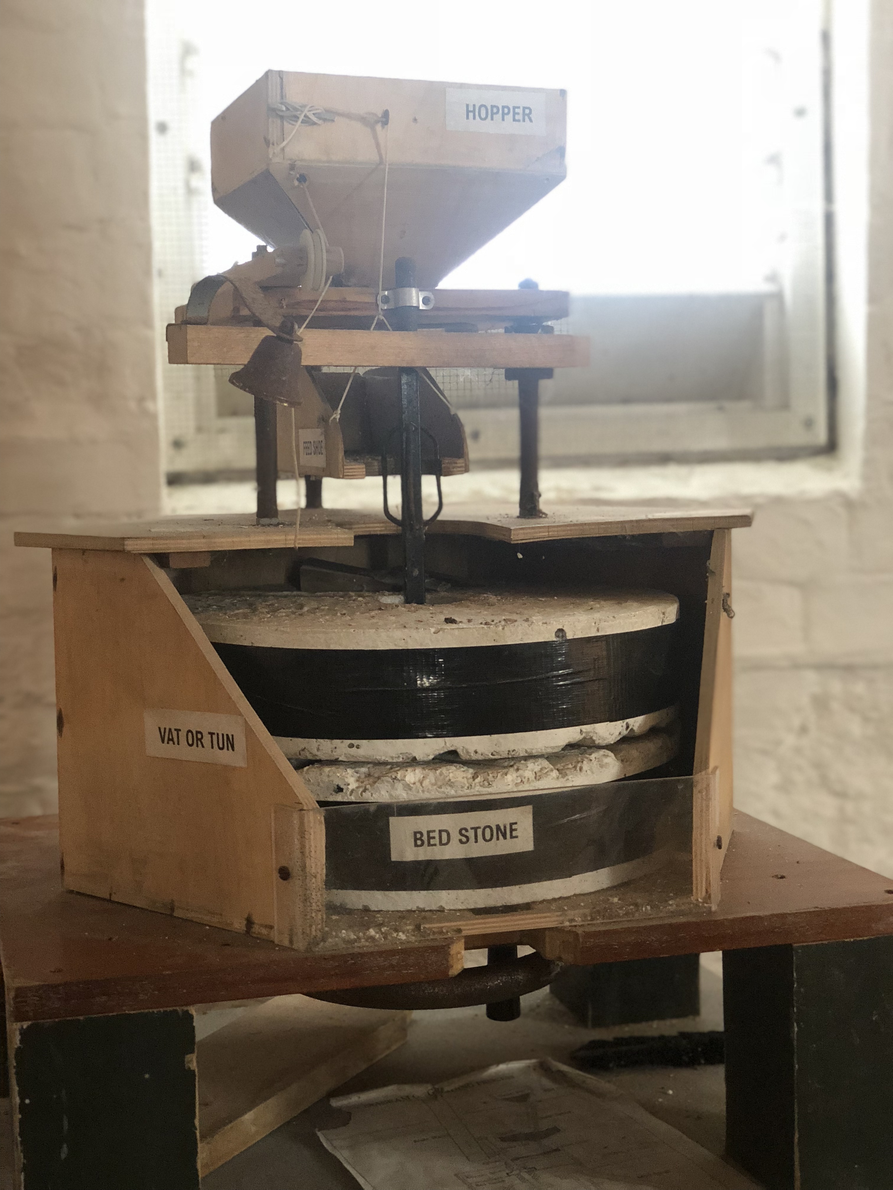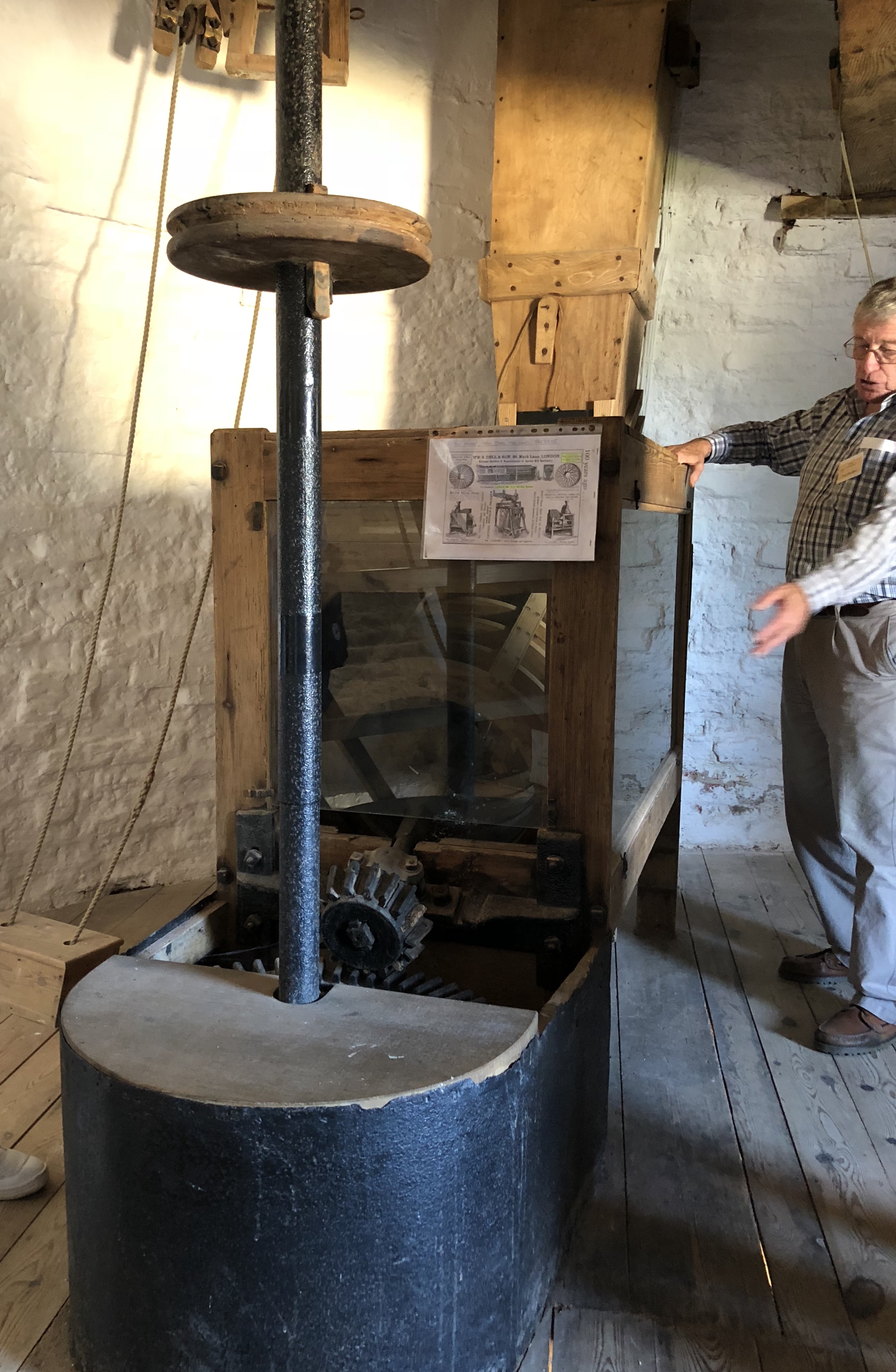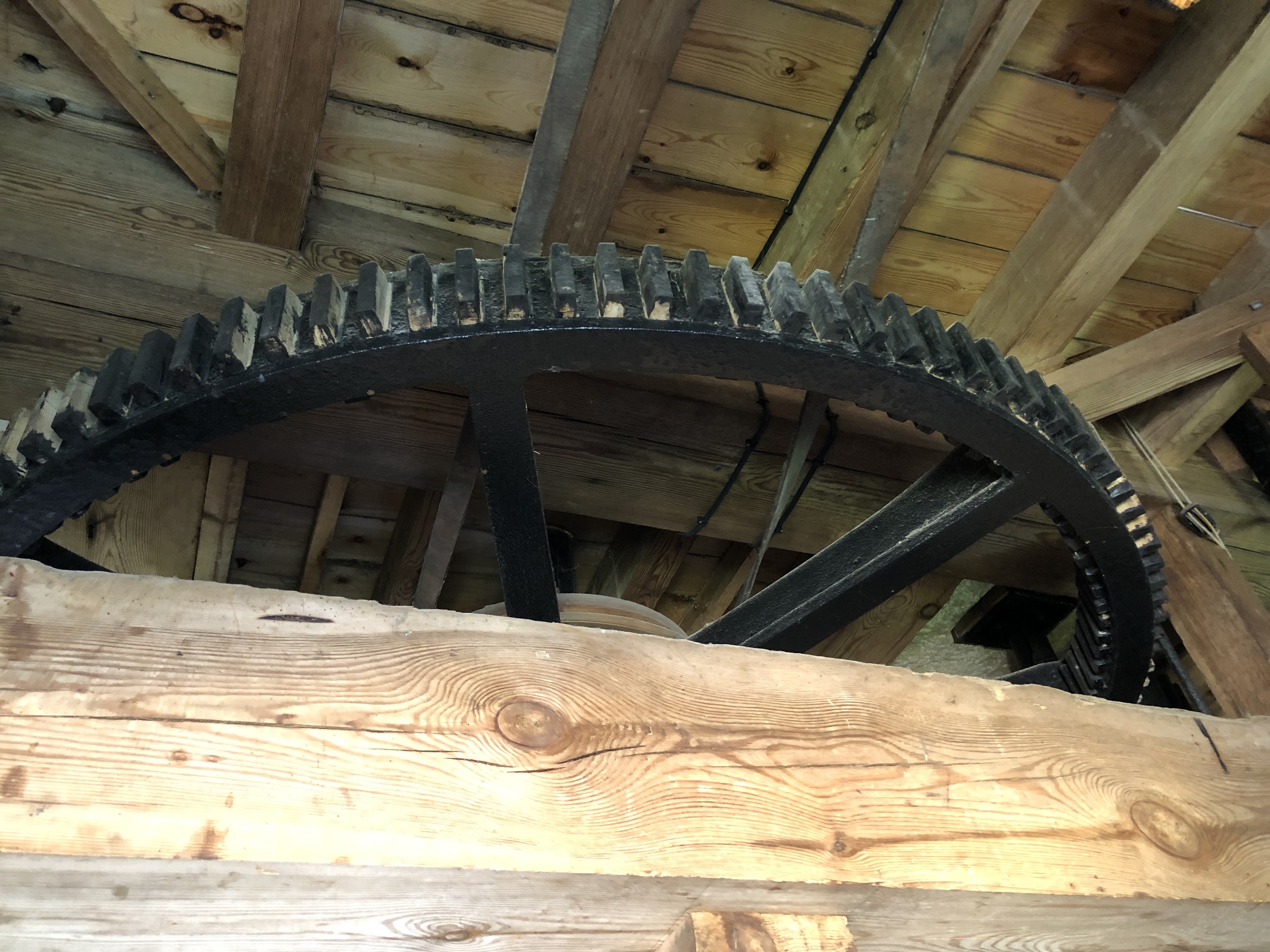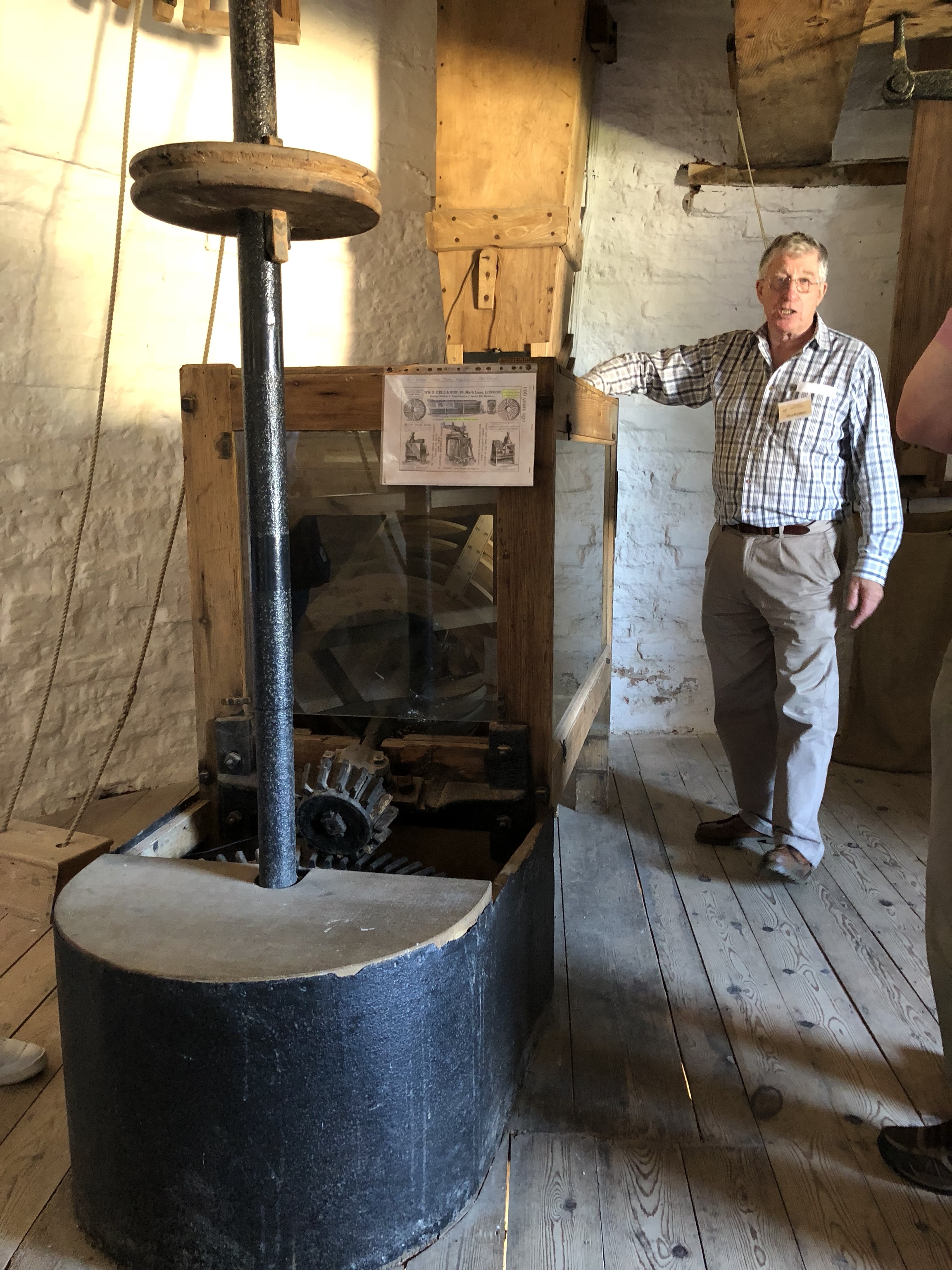 The tour starts on the top floor, which takes a while to reach because each staircase involves waiting for another group to descend out of our way. Once up there, in the dust room, we can see the fan tail and all the hoofing great iron and woodwork which harnesses the wind power directly.