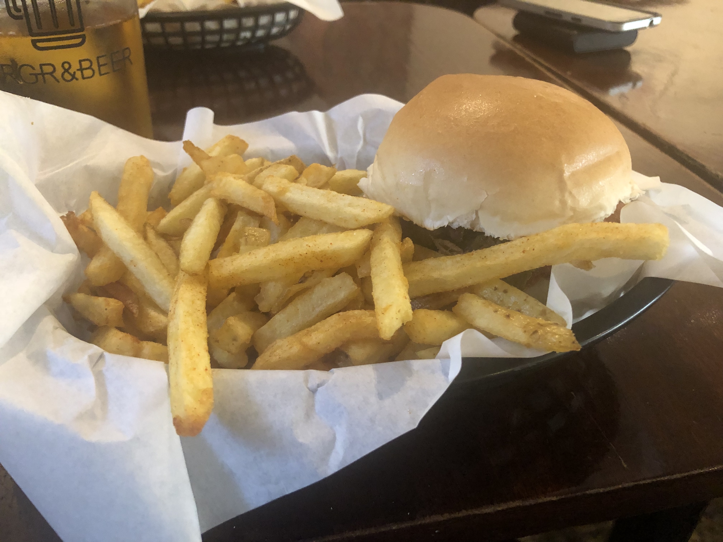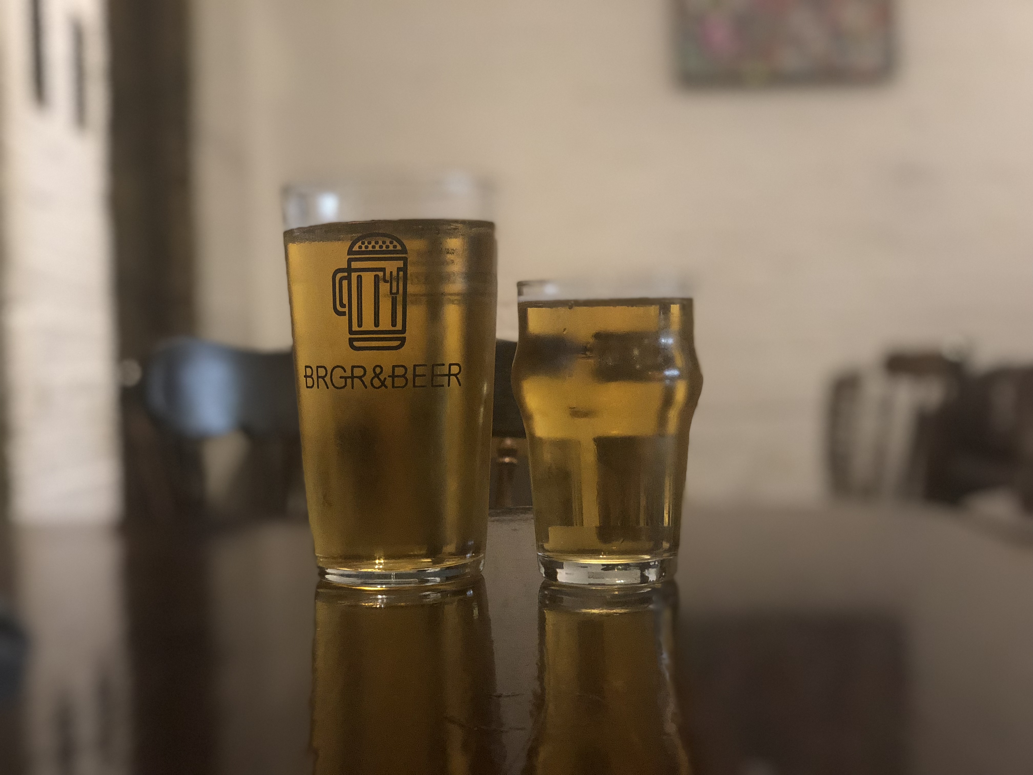 BRGR & Beer is a place that sells burgers and beer. Hurrah! I like those things! We get a pint and a half of their own lager, and apparently the last two burgers of the entire day. Good timing, again.
