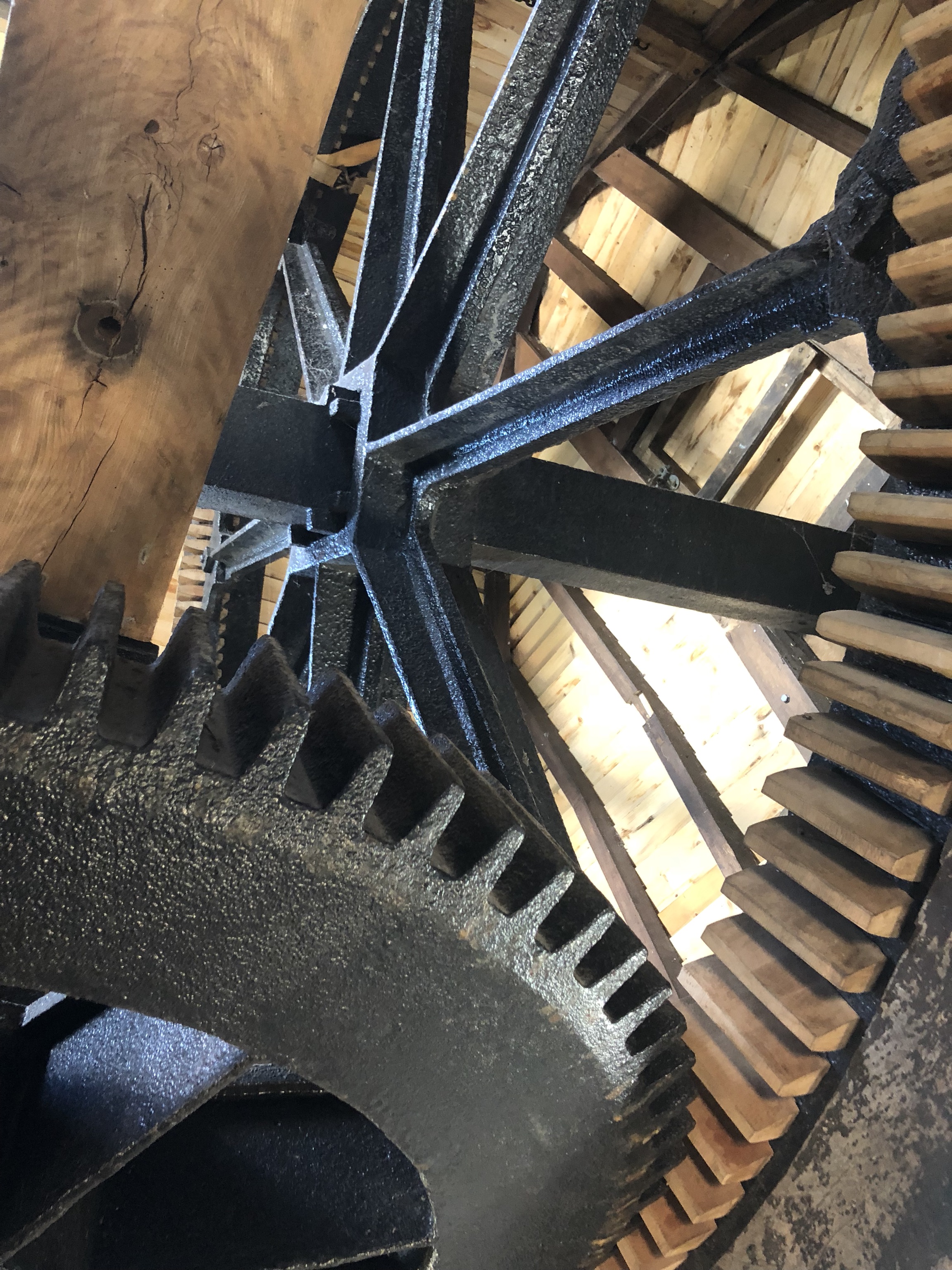The metal is cast iron – good because you don't have to grease it, which would create mud with all the flour and dust and stuff – and the wheel it meshes with has teeth of wood, for ease of maintenance and replacement.