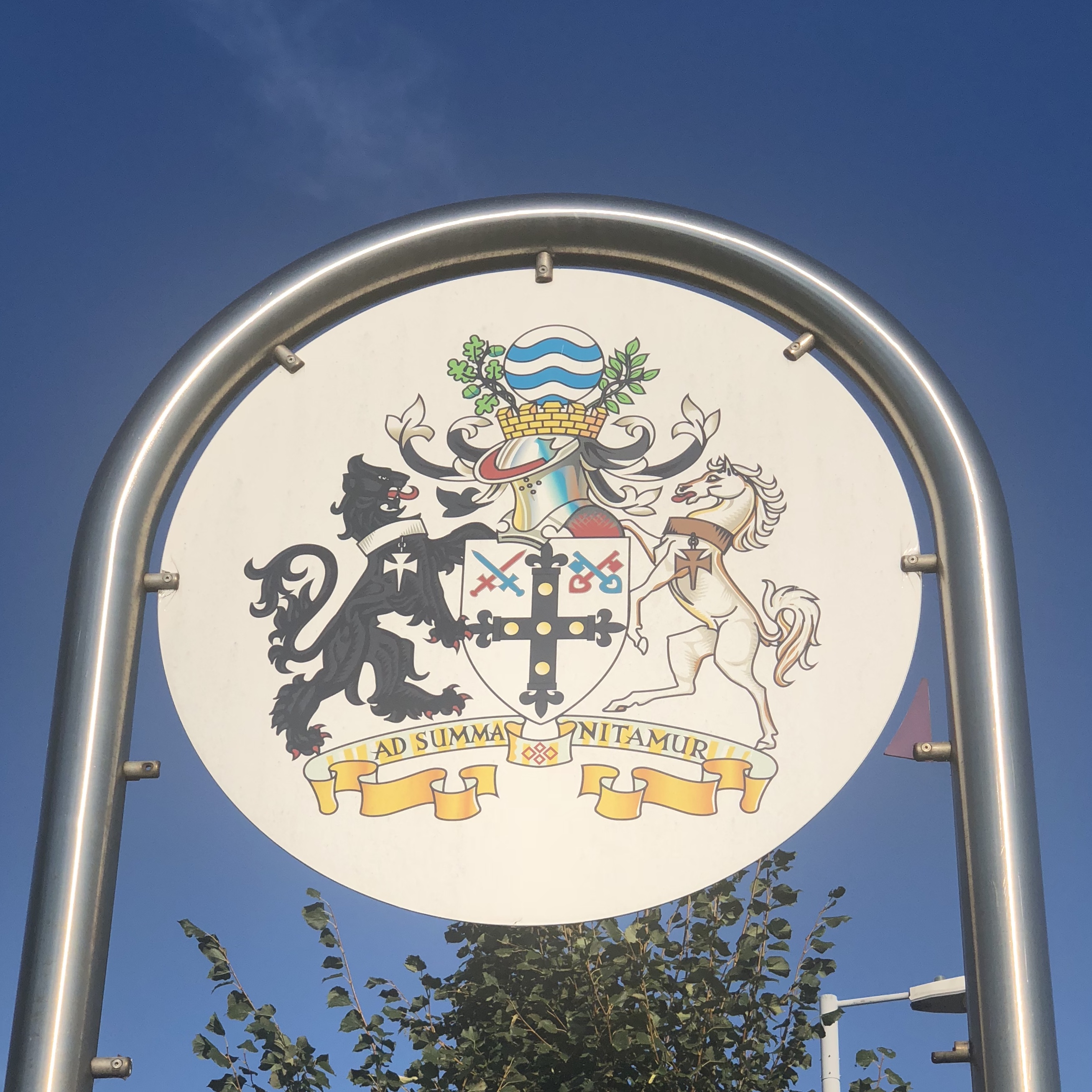 As we wander back up one main road onto another and Helen leads us to Wandle Park tram stop, I'm looking online on some heraldry wiki and shit the bed, that's Croydon's coat of arms. So there we go. There's a "you're in Croydon" sign, but it very much is not a welcome sign. Perhaps that's why I got honked by a white van man while taking the photo?