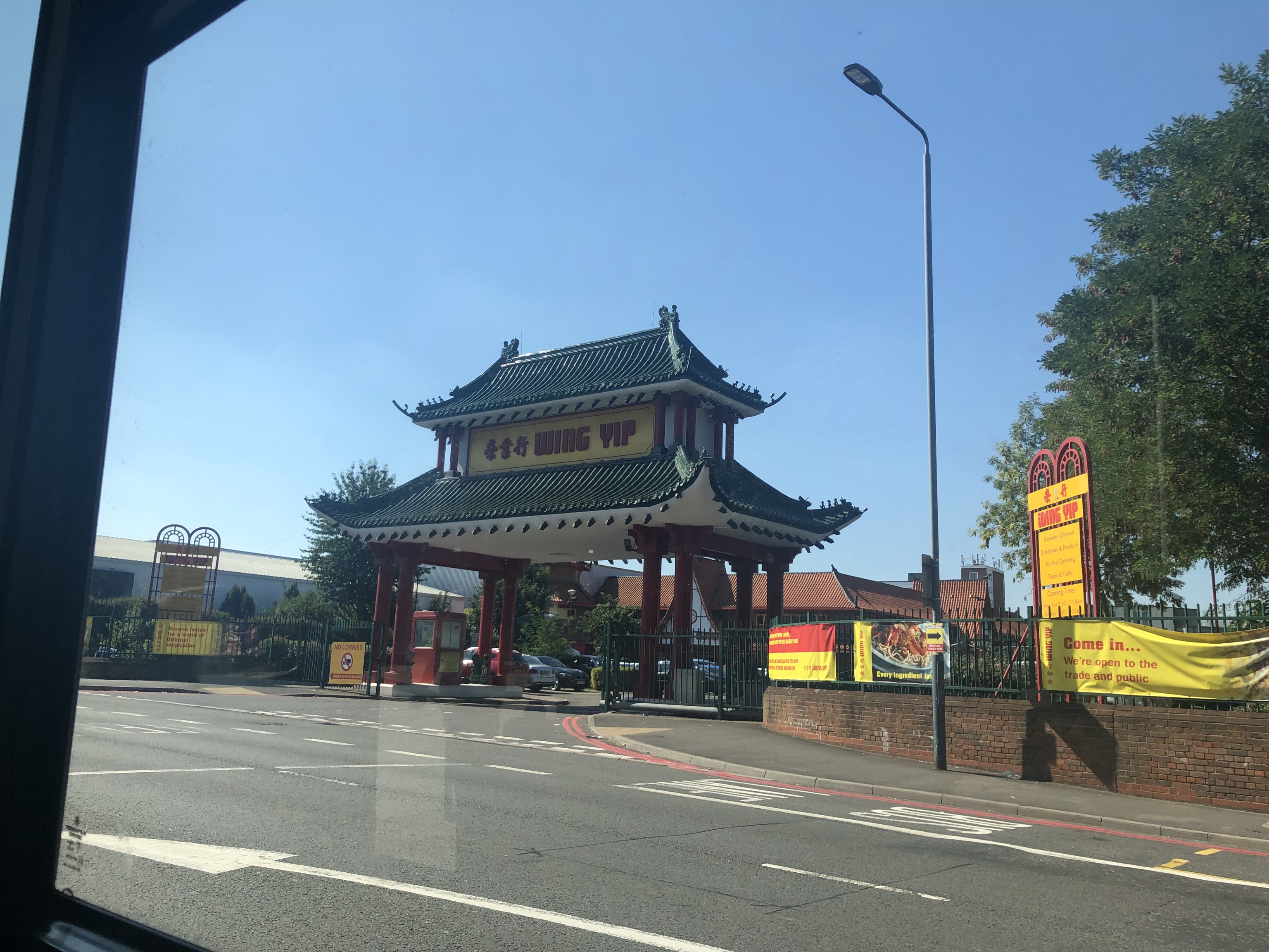 Our bus arrives to take us to the airport, which is also on the Purley Way. It really is one big busy main road, and it's an unpleasant stop-start traffic-jam of a journey, with only "Kevin News" and this Wing Yip supermarket to entertain us.