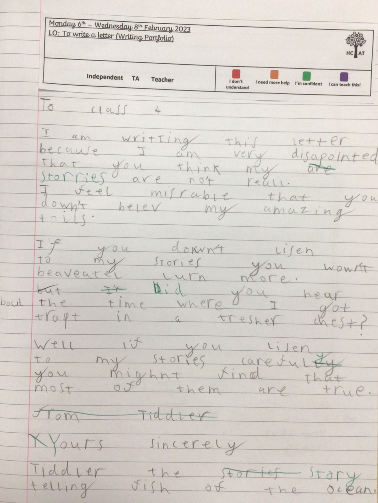 Our second literacy text was Tiddler (the story telling fish of the ocean) by one of our favourite authors, Julia Donaldson. The outcome was to write a letter about how disappointed Tidder was that nobody believed his amazing adventures.