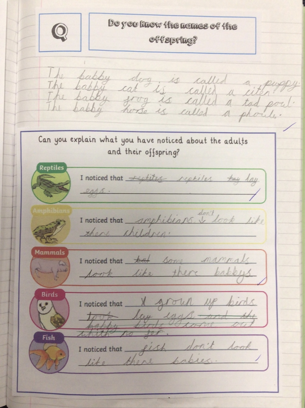 We have continued to explore animals including humans this half term. We have looked at the offspring of different animals and identified animals that lay eggs. We then worked scientifically to find out how exercise affects our bodies.