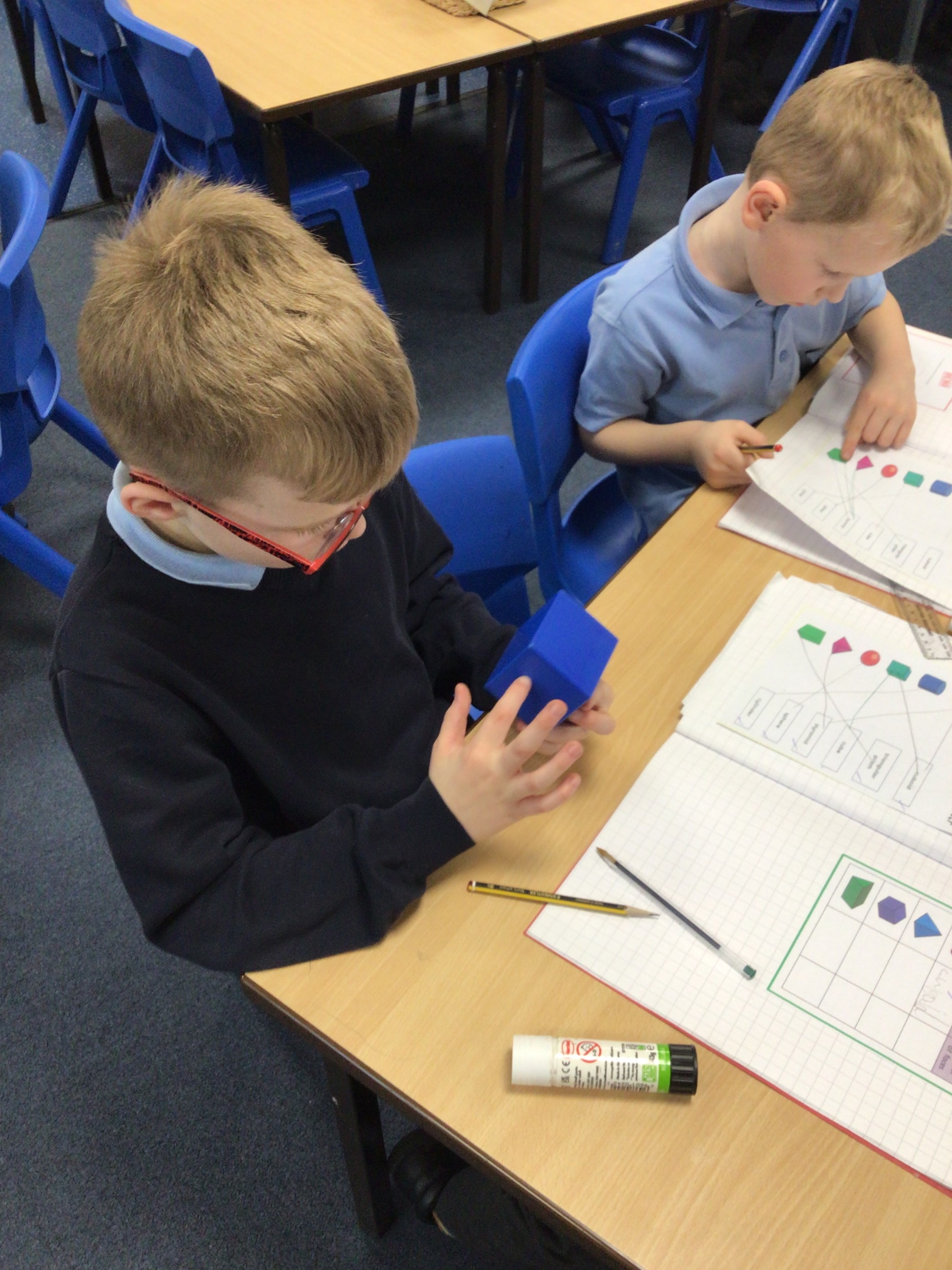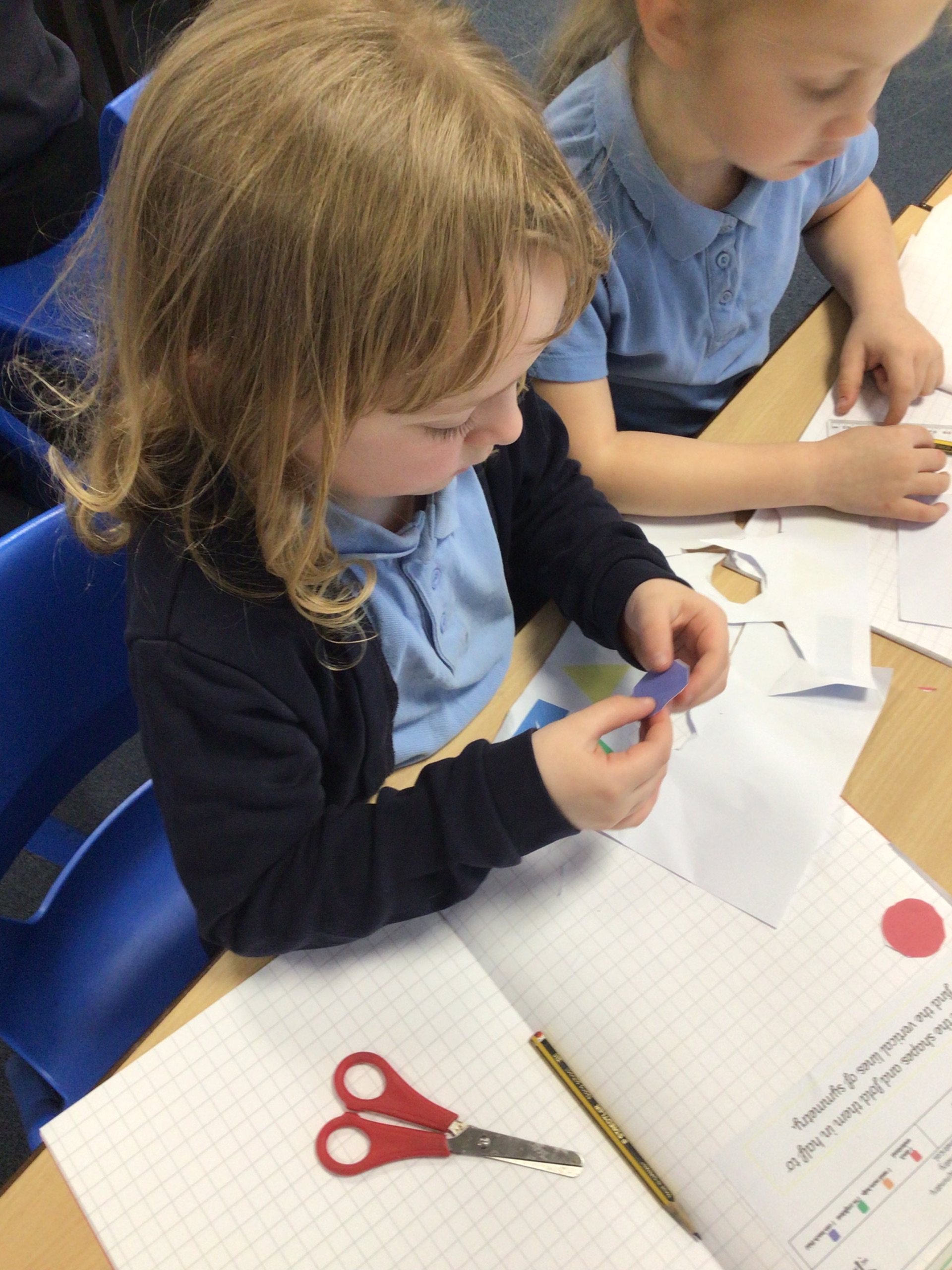 We became more confident at recognising and naming 2D and 3D shapes and describing their properties. We were able to identify the 2D shapes on the surface of 3D shapes and we enjoyed exploring the lines of symmetry on 2D shapes.