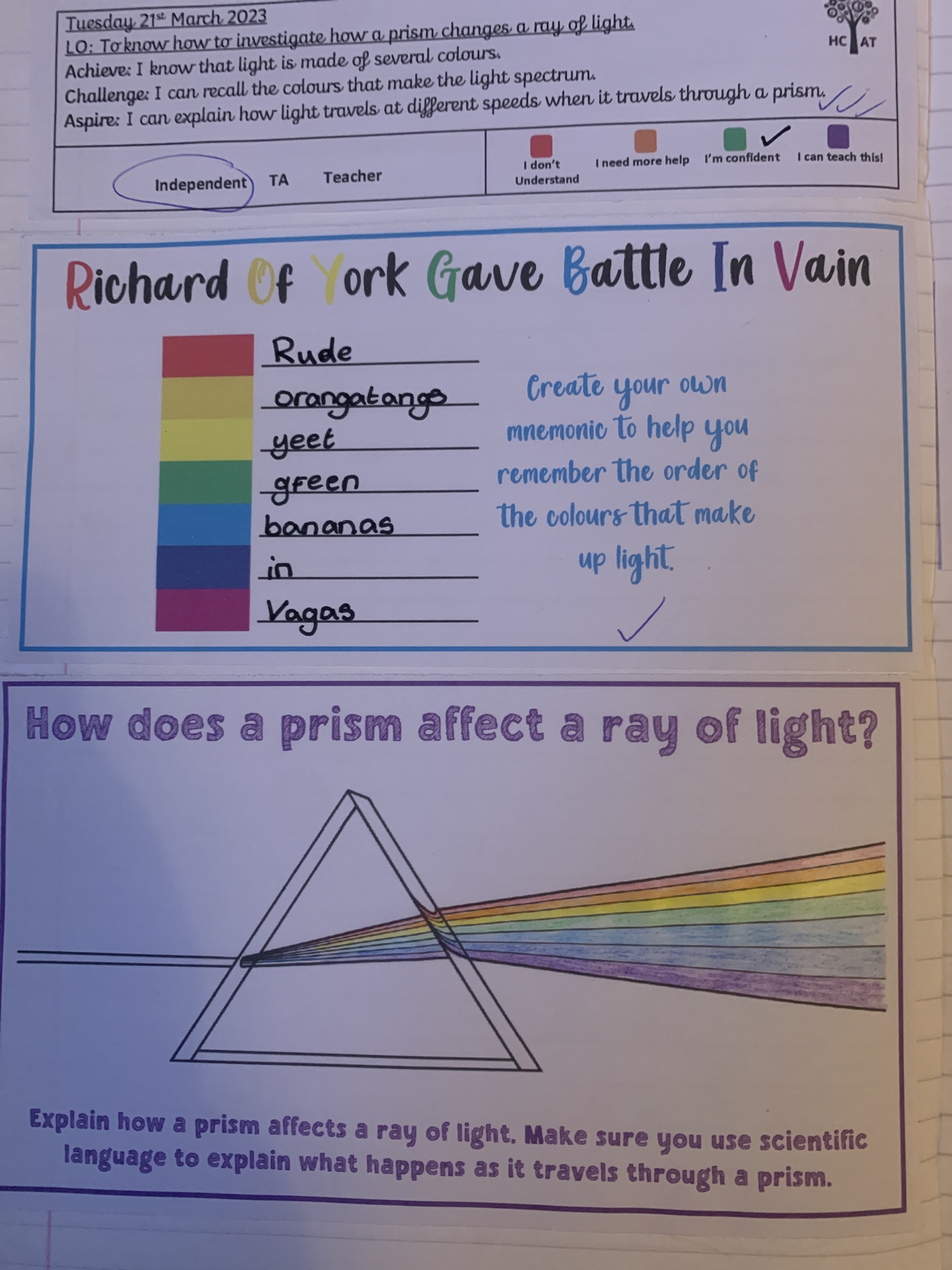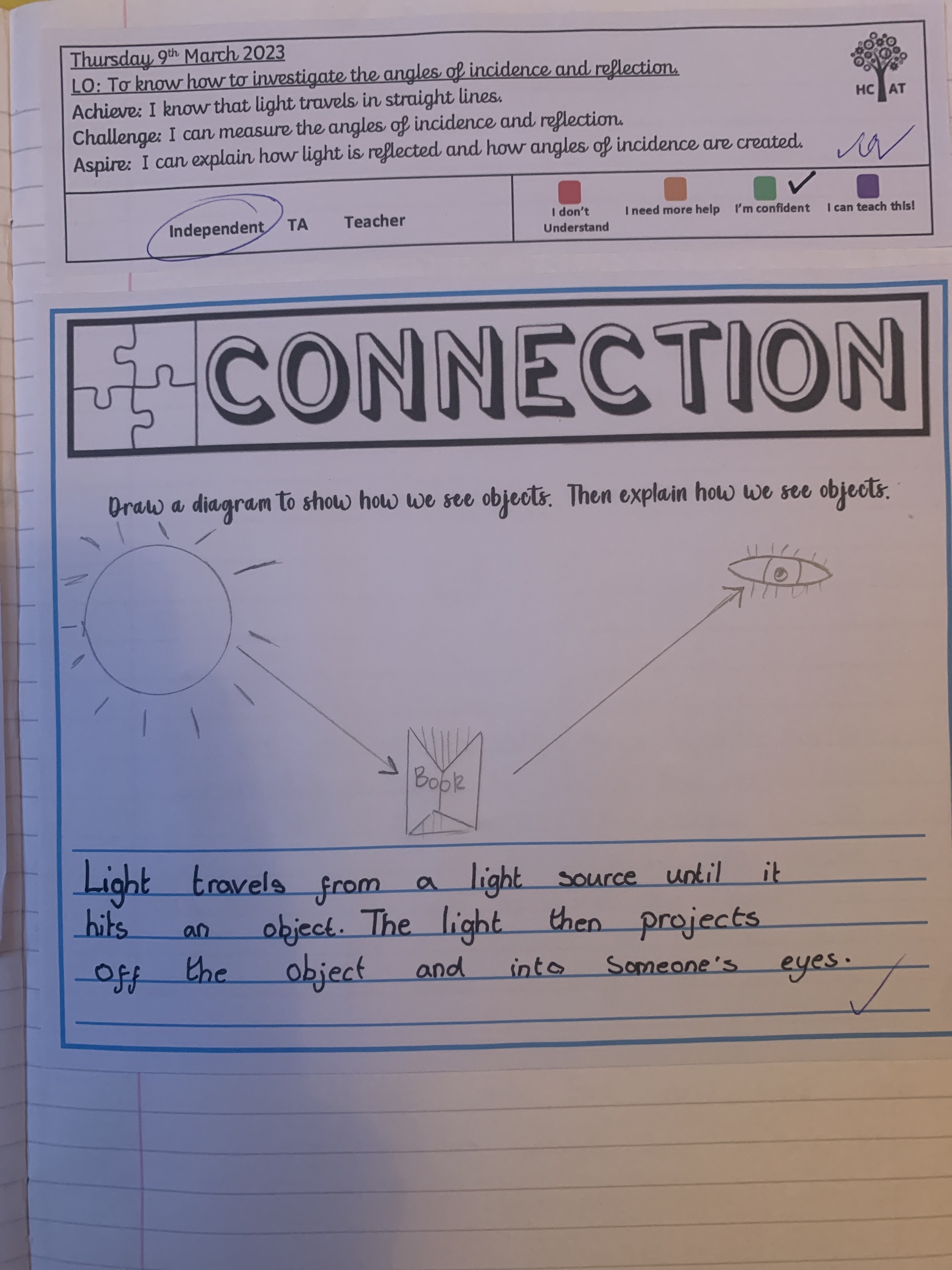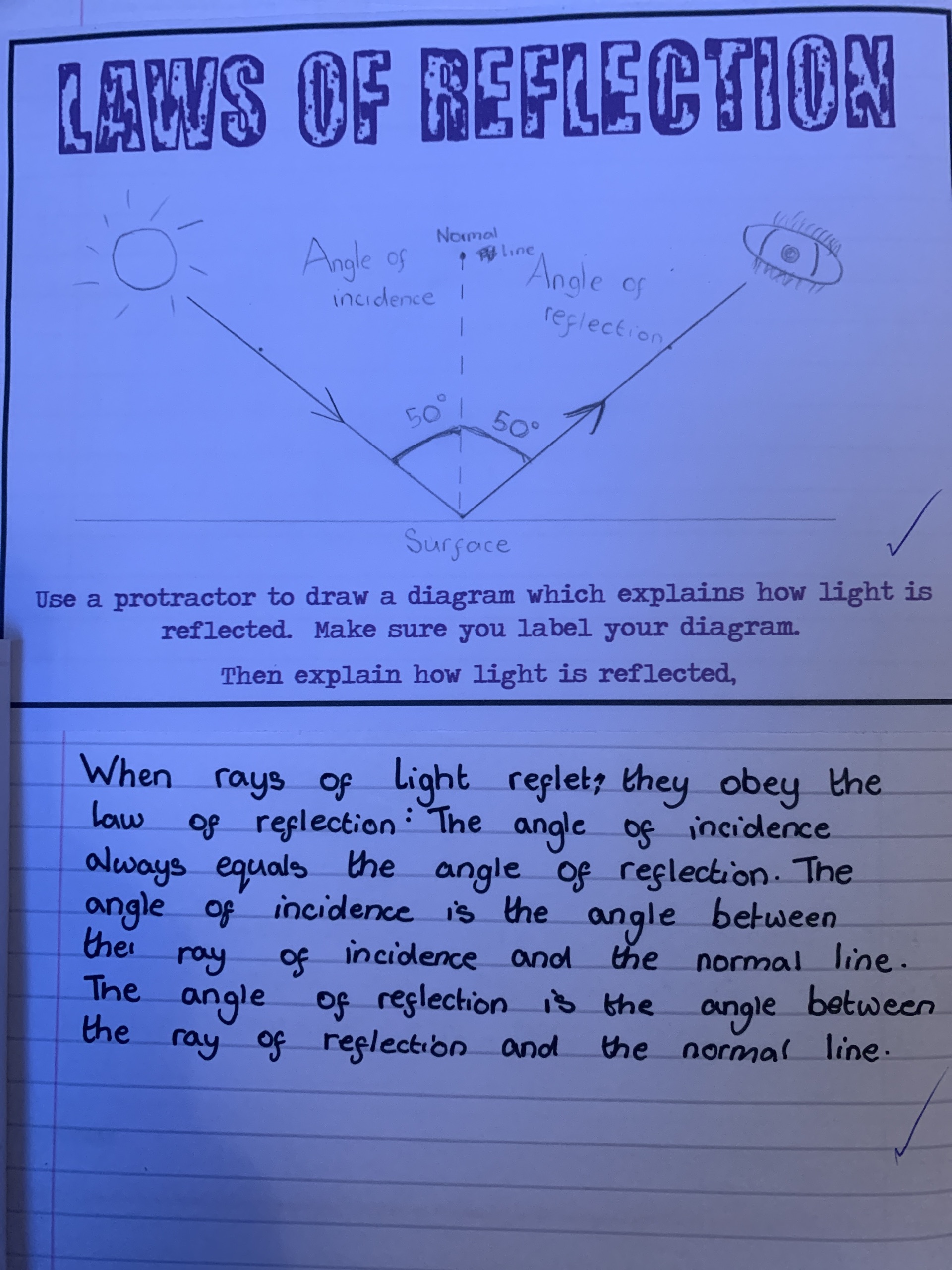 During this unit, we learnt all about artificial and natural light sources, how light travels in straight lines and leads to the creation of shadows. We also learnt about the angles of incidence and reflection, as well as the refraction of light and the composition of white light when split by a prism.