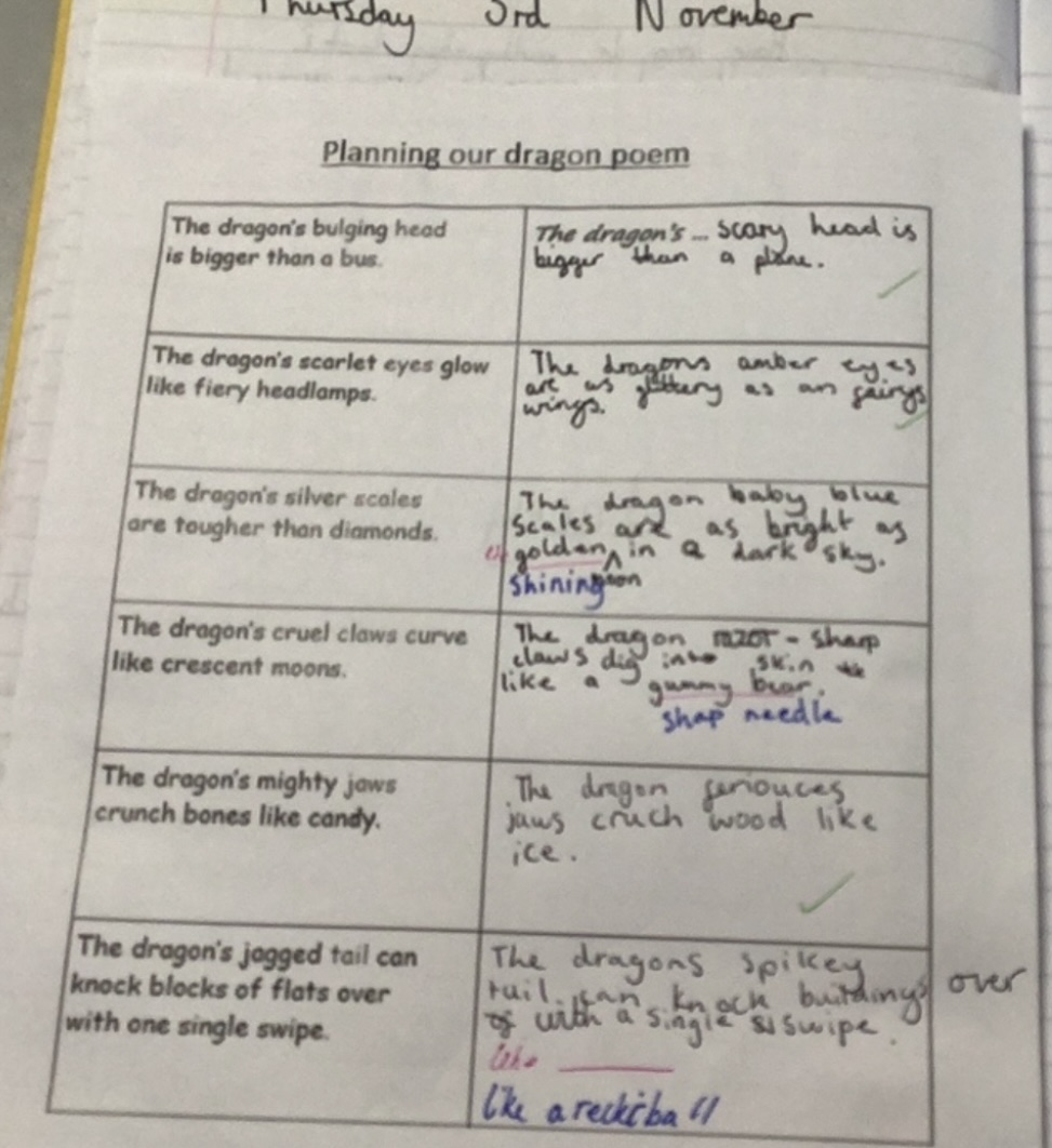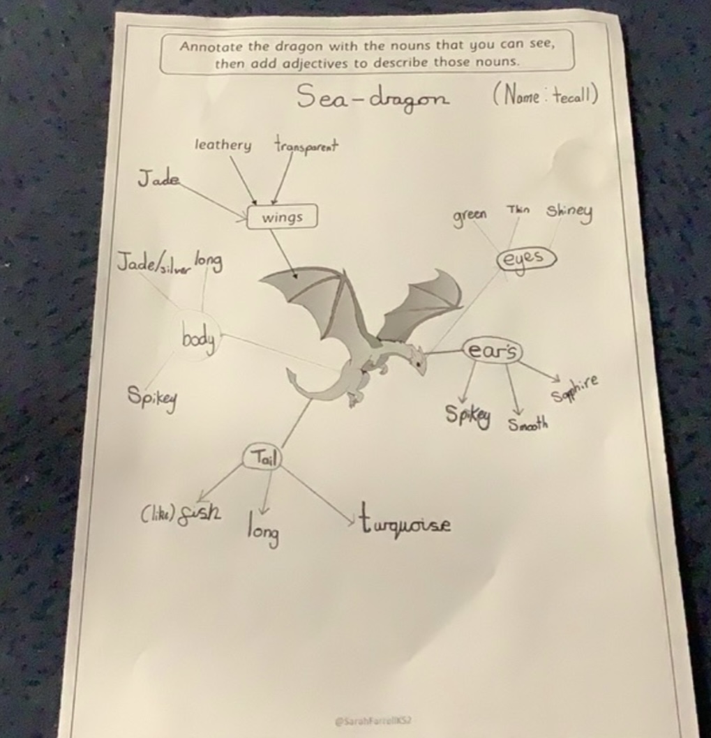 In English we looked at expanded noun phrase and adjectives to describe different dragons using the book, Tell me a Dragon by Jackiw Morris. The pictures helped us think of lots of features of dragons and ways to describe these. We used this to think of similes to help us write a poem about our own dragon.