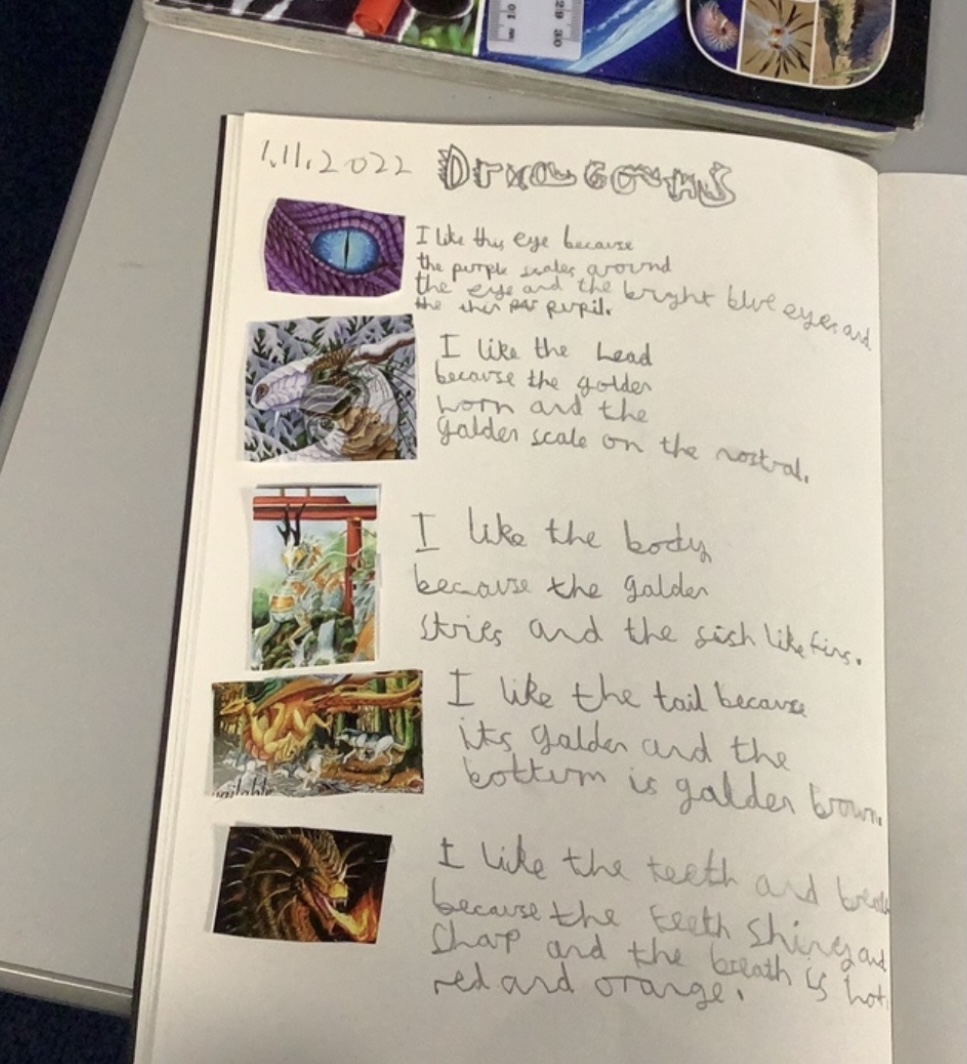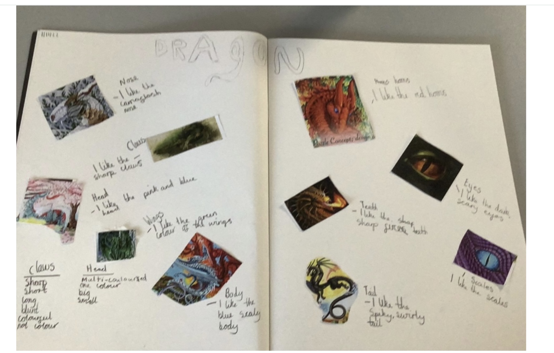 In art we looked at different drawings of dragons to see what we liked about them and how different dragons are portrayed. We chose our favourite to help us when we start drawing our own dragon.