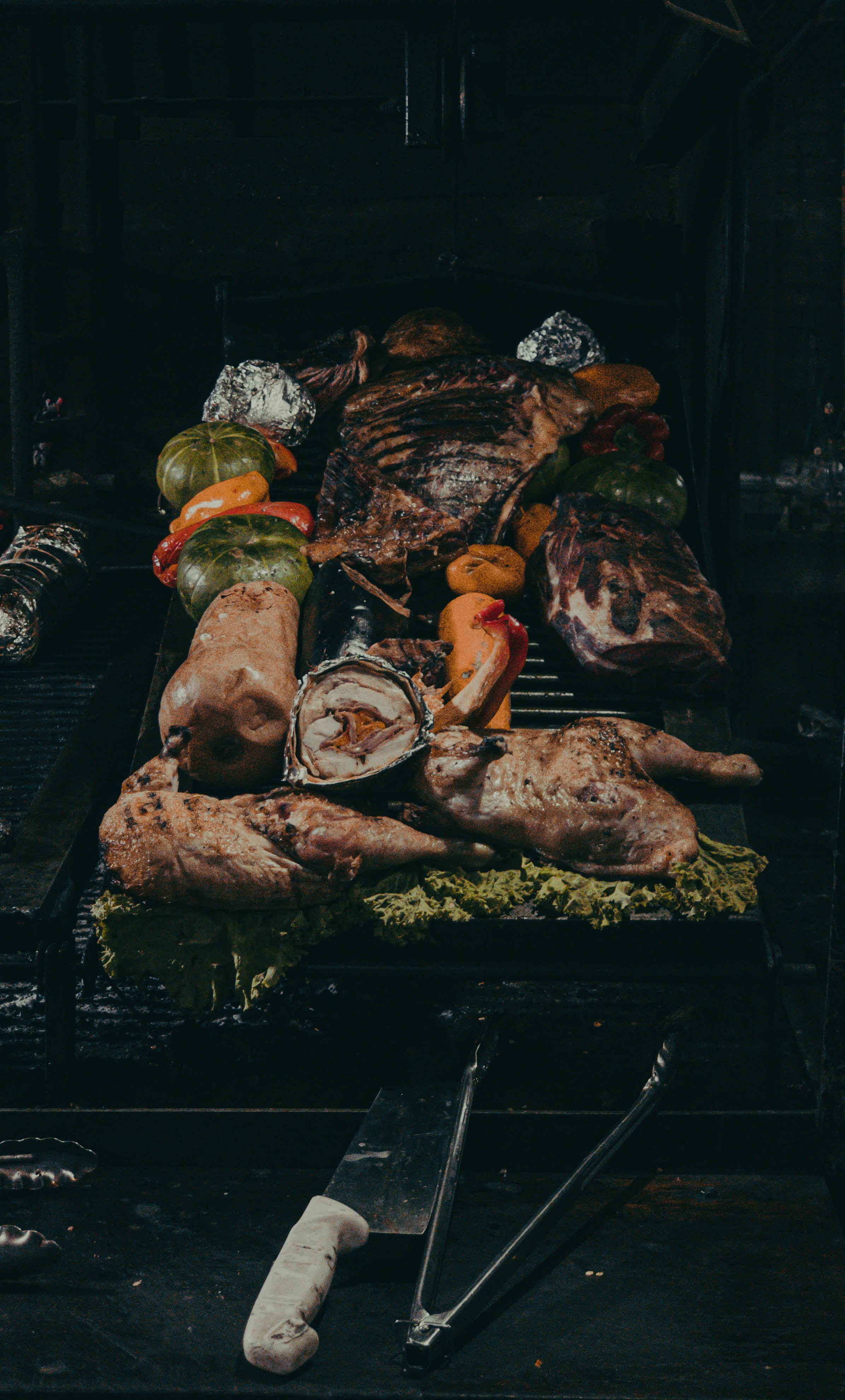Há sempre espaço para cebolas, pimentões, abobrinhas e toda sorte de legumes a defumar nas grelhas e nos espetos.