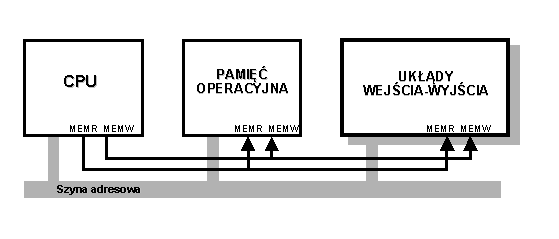 W przypadku układów współadresowanych z pamięcią operacyjną wybieramy obiekt, na którym dokonujemy operacji (komórka pamięci lub rejestr układy we/wy), za pomocą adresu. Sygnały sterujące są wspólne dla pamięci oraz układów we/wy.