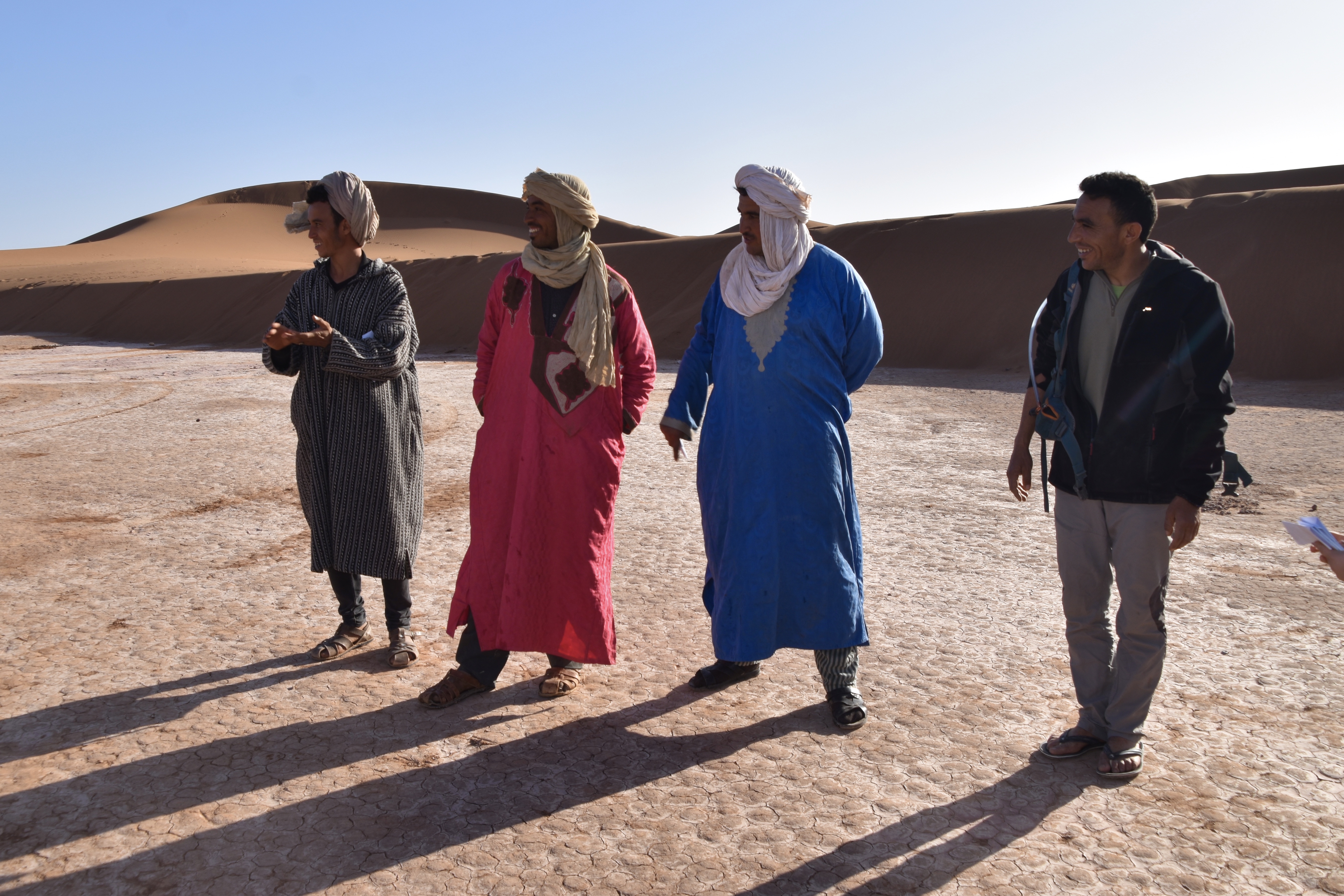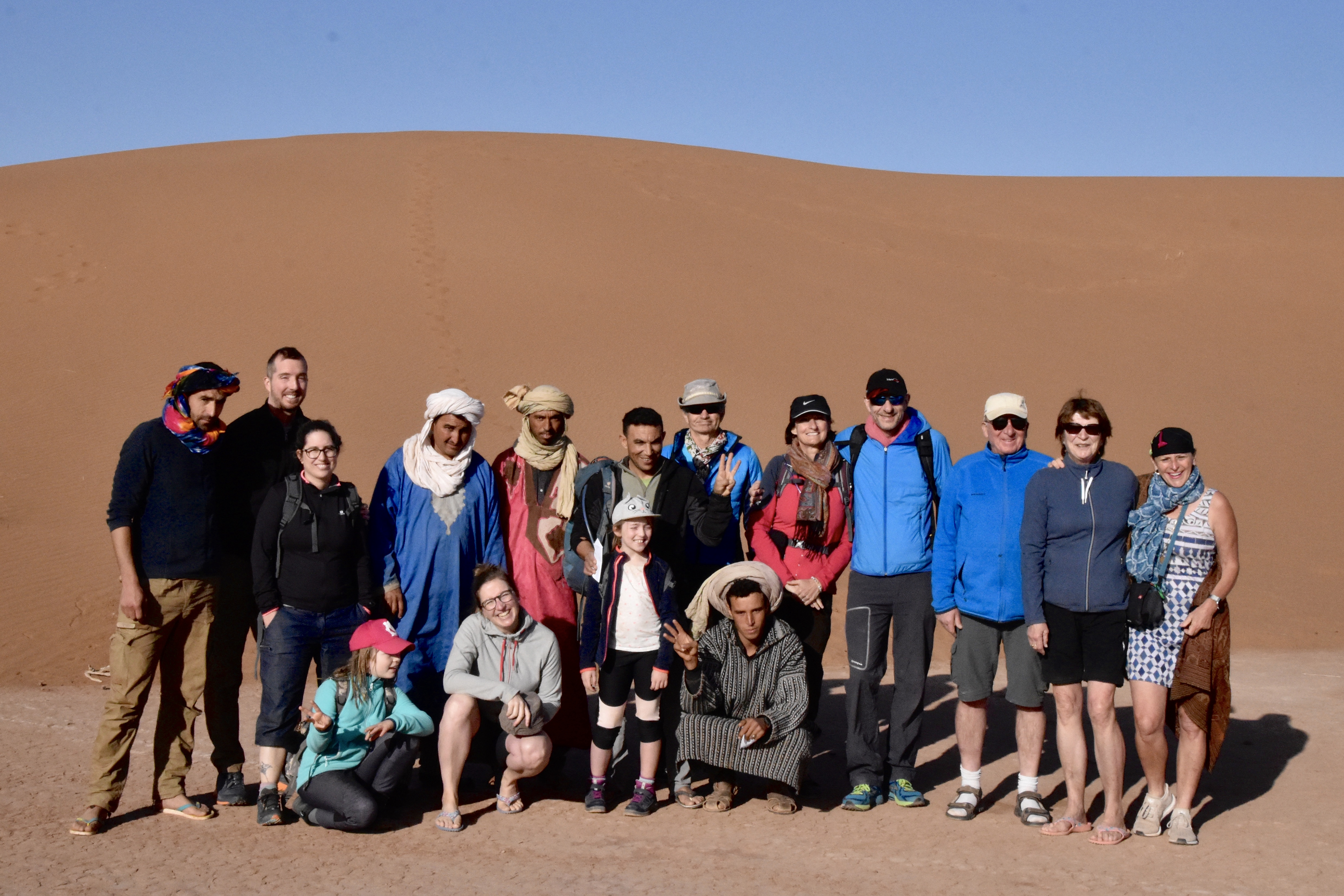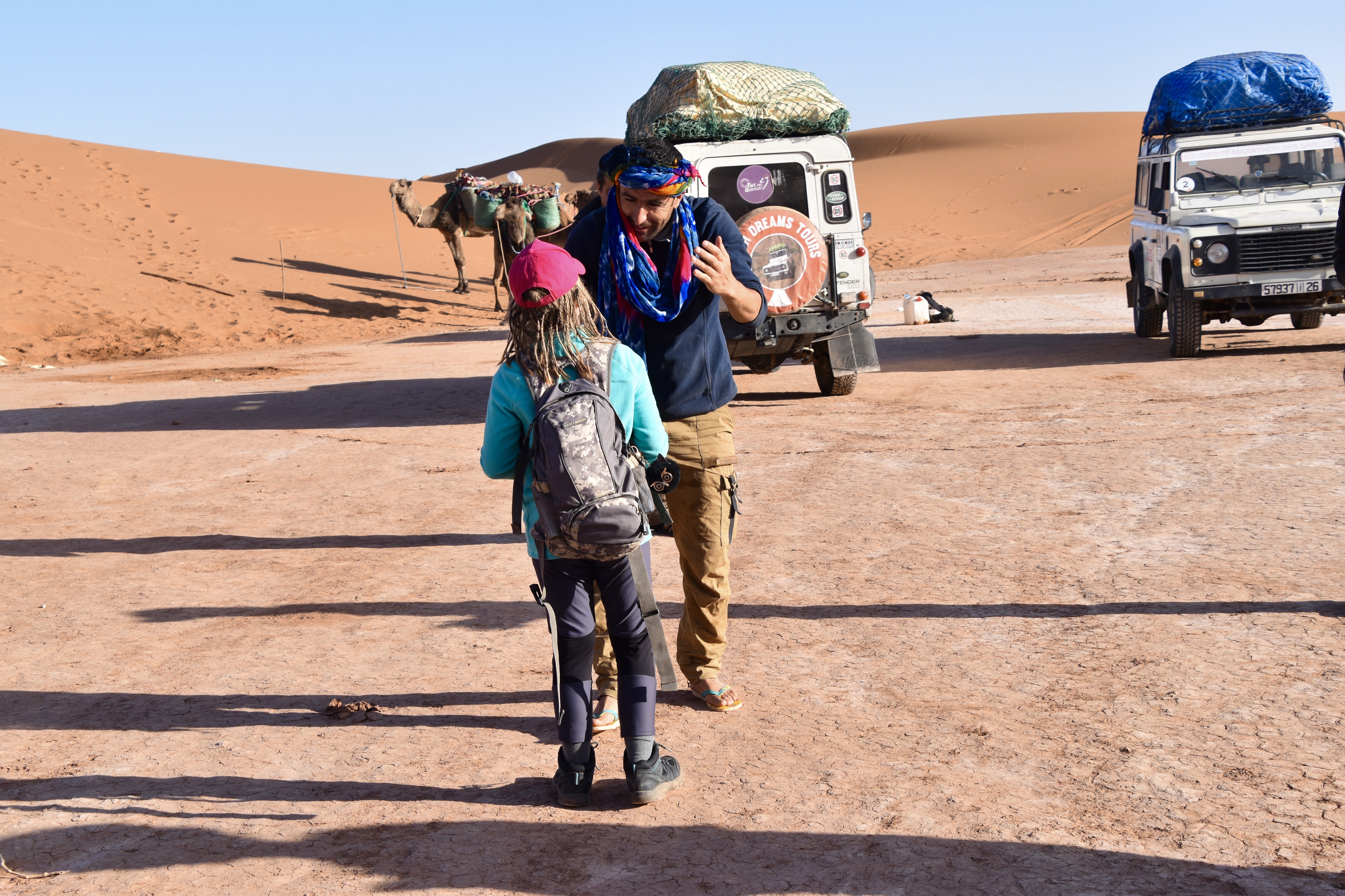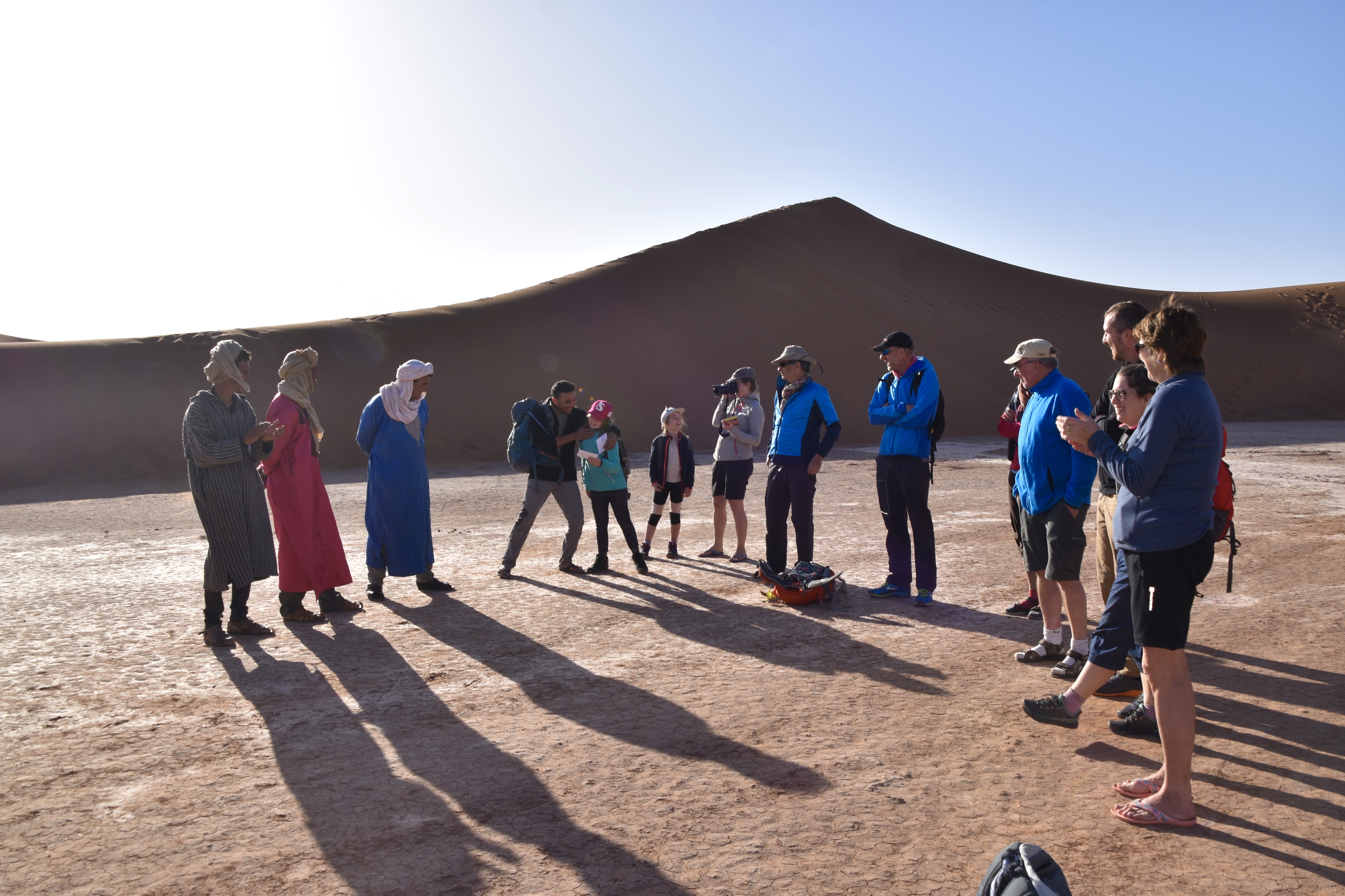 Tous prêts au départ, alors il faut bien immortaliser le lavage des dents devant la dune. Derniers gestes avant de monter dans les 4x4 qui nous amèneront à Foum Zguid où nous retrouverons le transfert pour Marrakech avec halte “bivouac“ à Aït Bin Haddou.