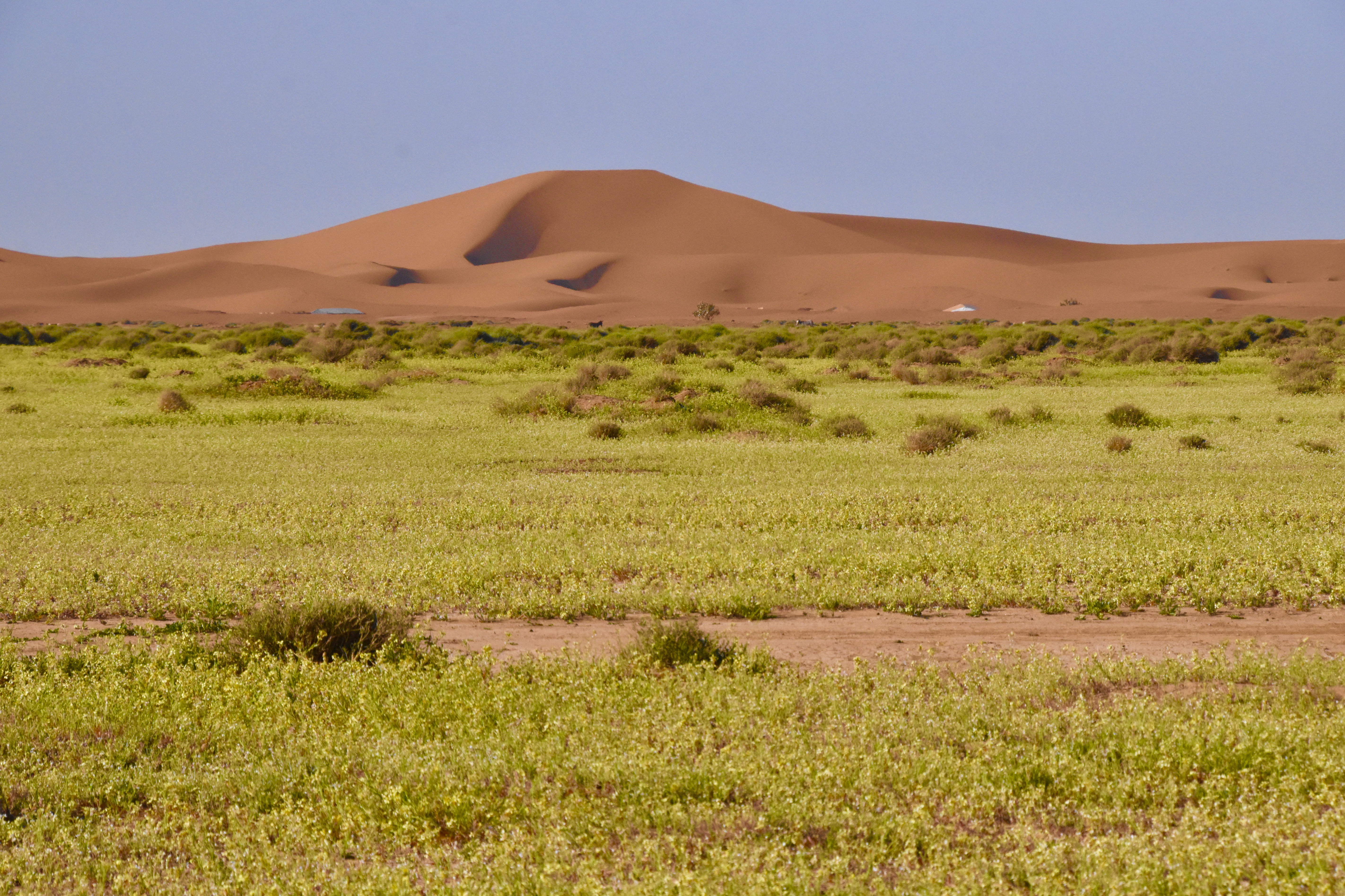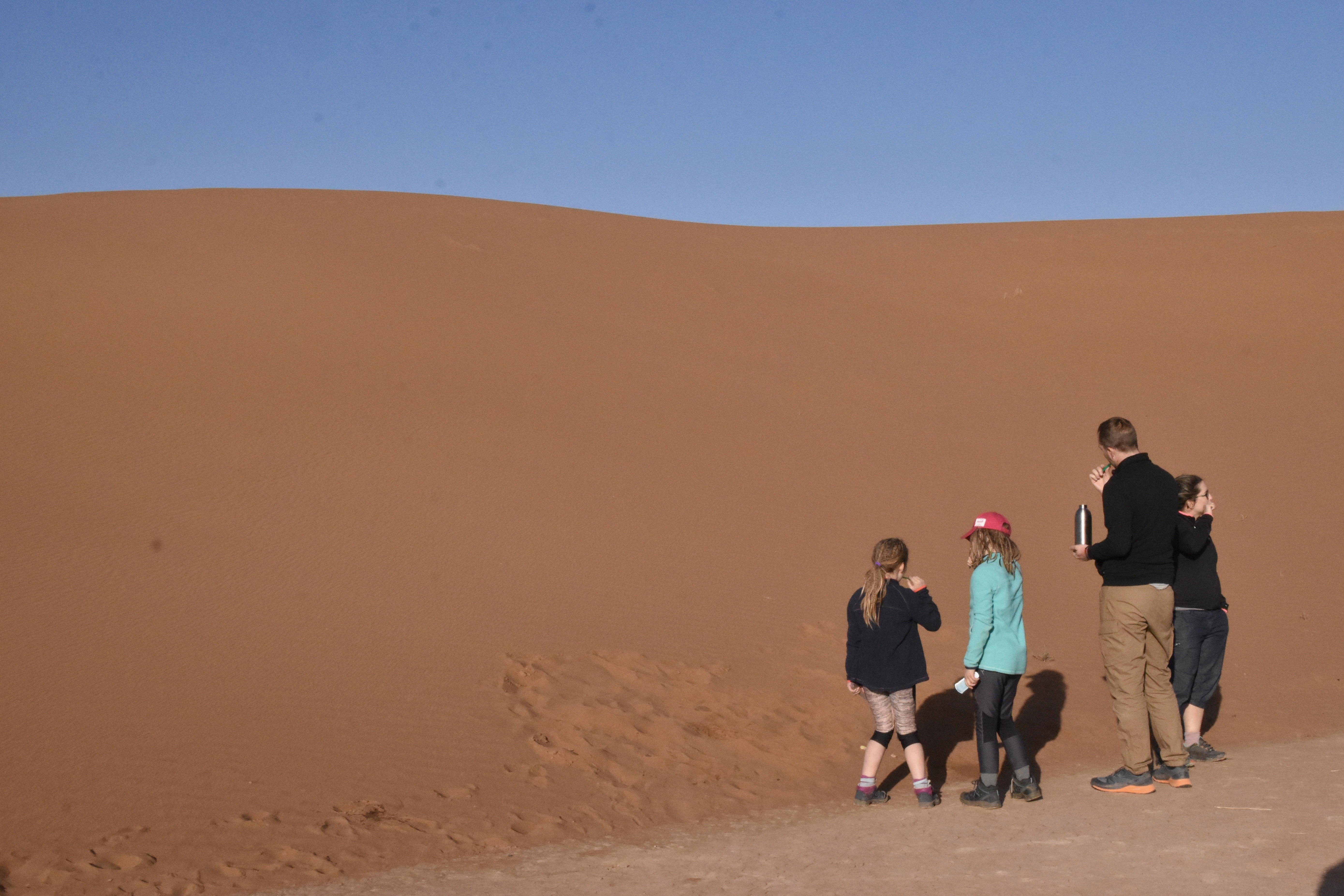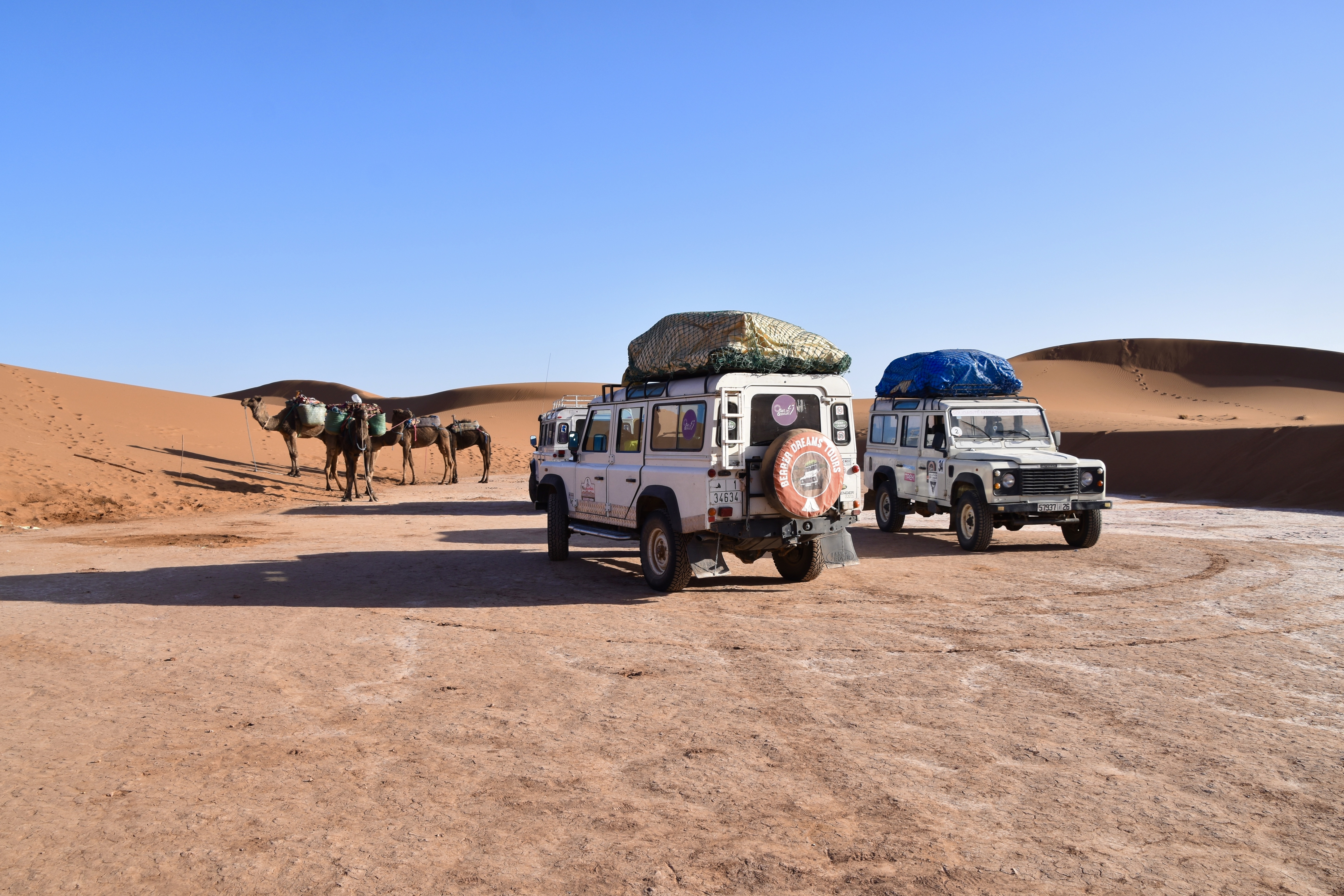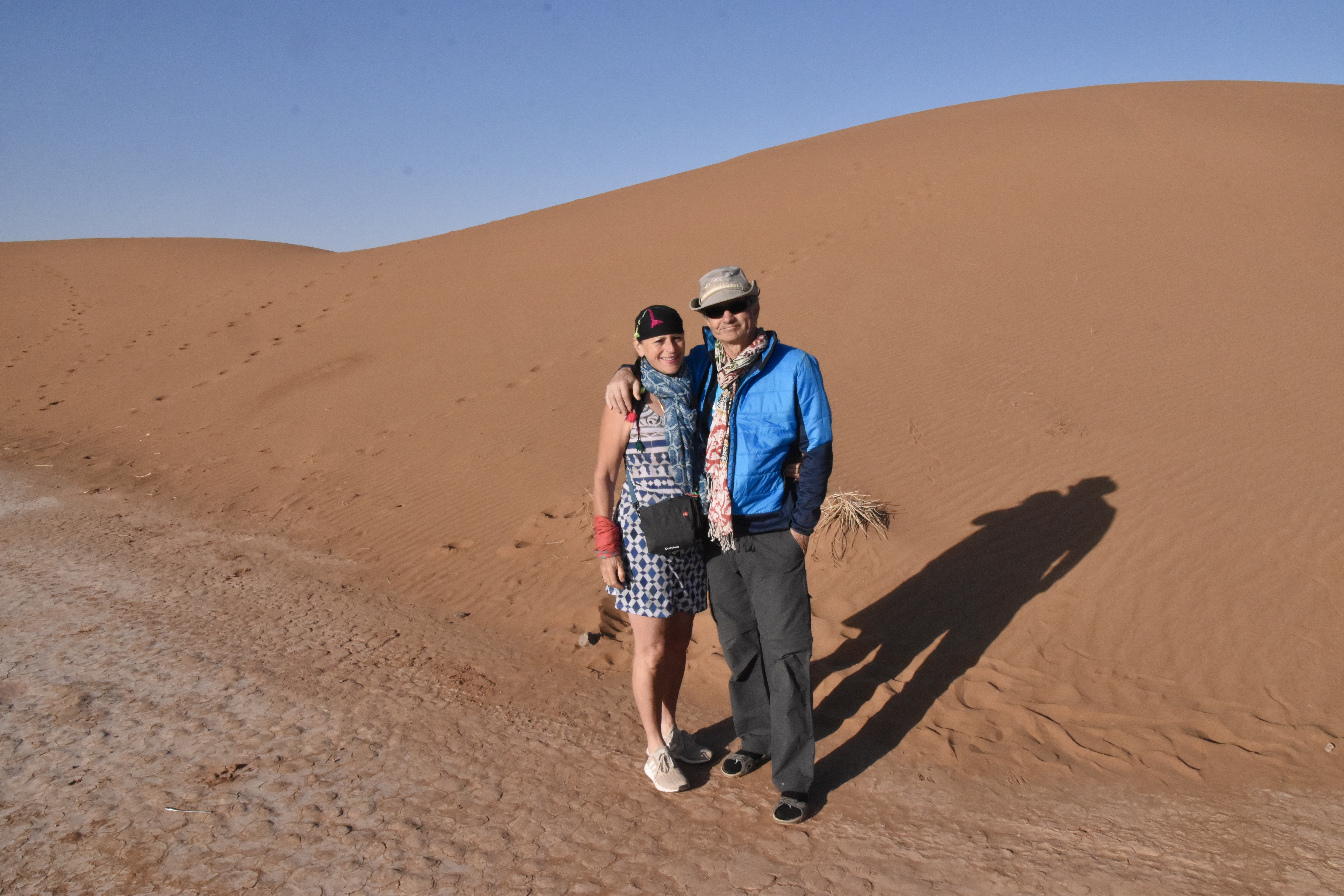 Tous prêts au départ, alors il faut bien immortaliser le lavage des dents devant la dune. Derniers gestes avant de monter dans les 4x4 qui nous amèneront à Foum Zguid où nous retrouverons le transfert pour Marrakech avec halte “bivouac“ à Aït Bin Haddou.