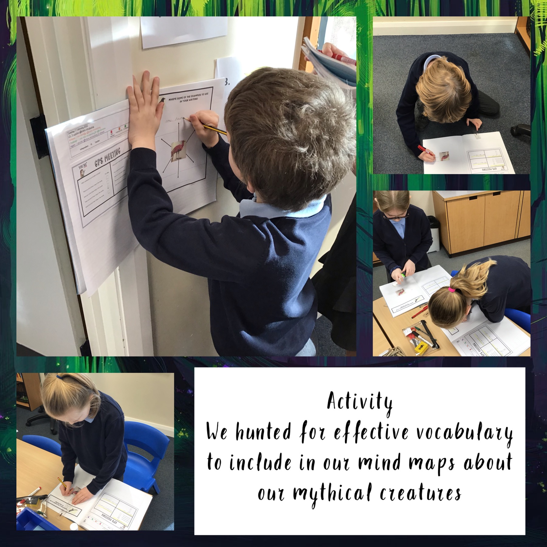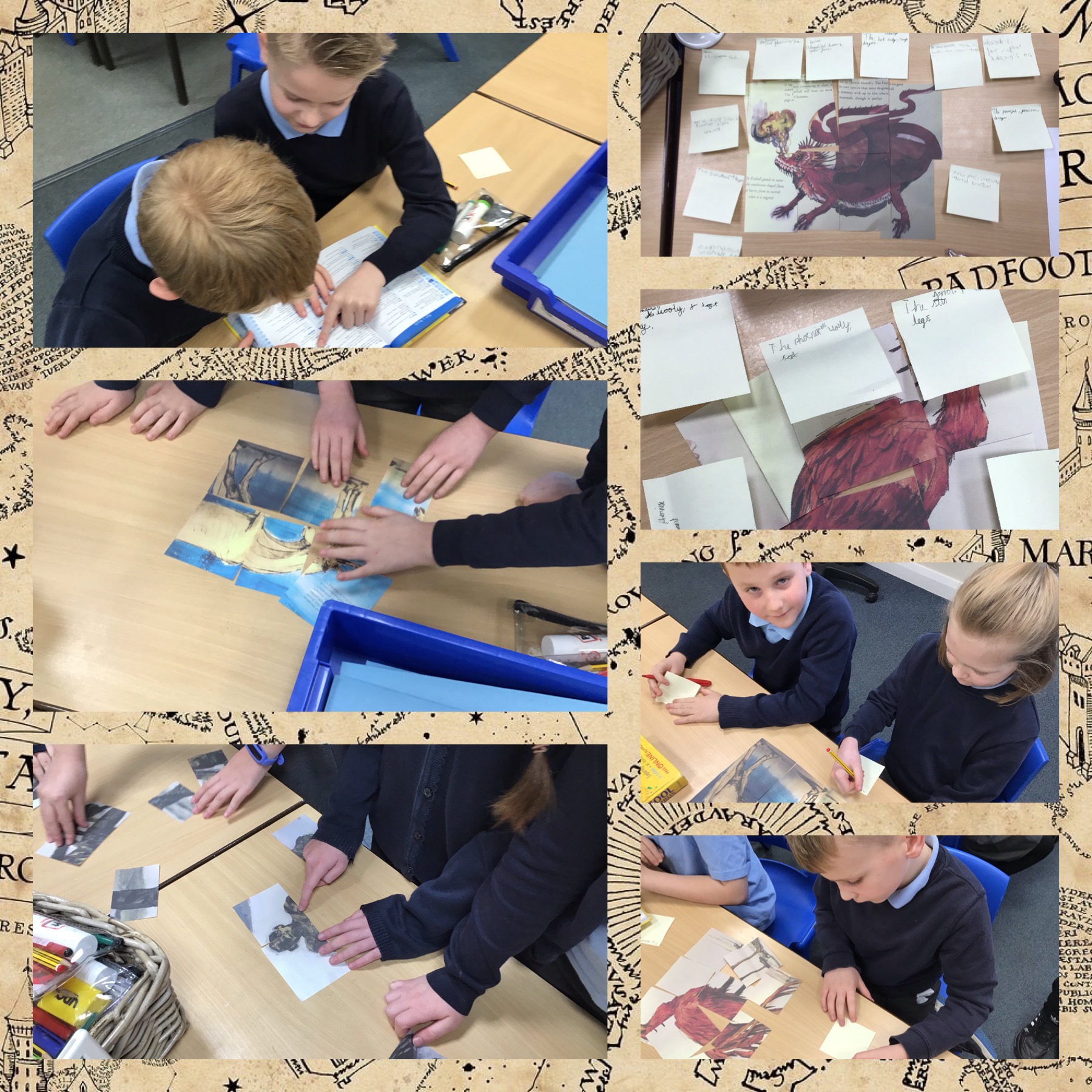 Our second piece was an explanation text, focusing on mythical creatures from the Harry Potter universe. As a hook, we pieced together images of different creatures from Fantastic Beasts and Where to Find Them by J.K Rowling. We then used post-it notes to splat expanded noun phrases around each creature.