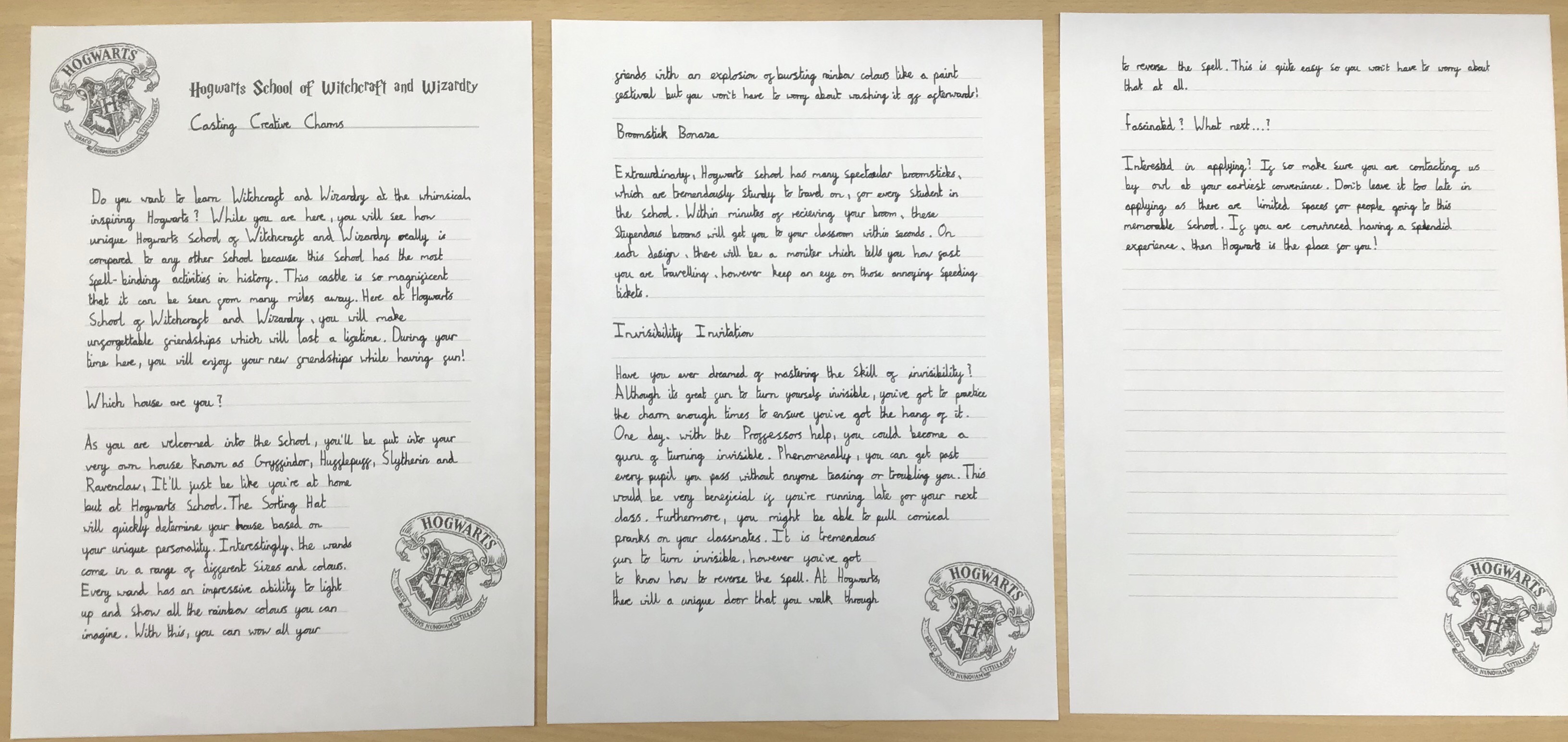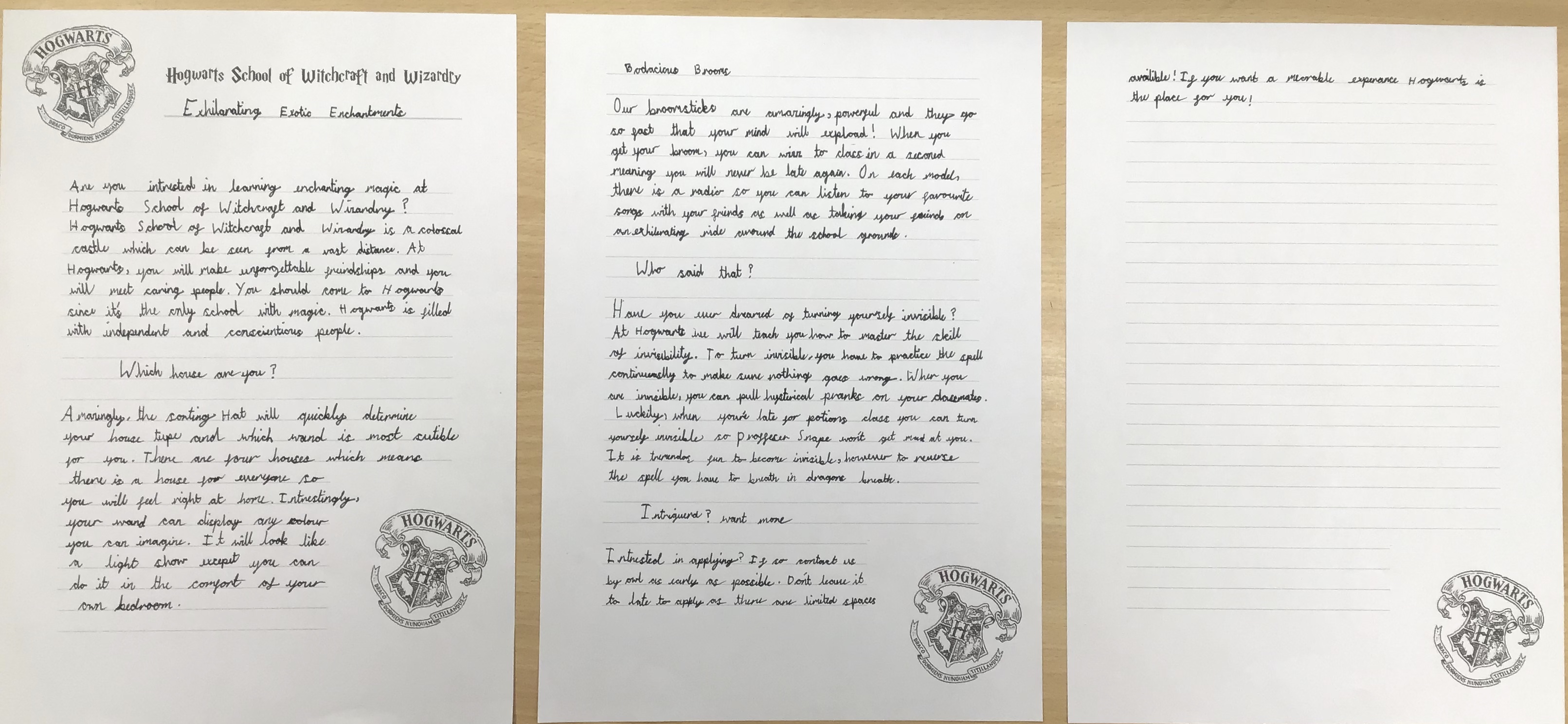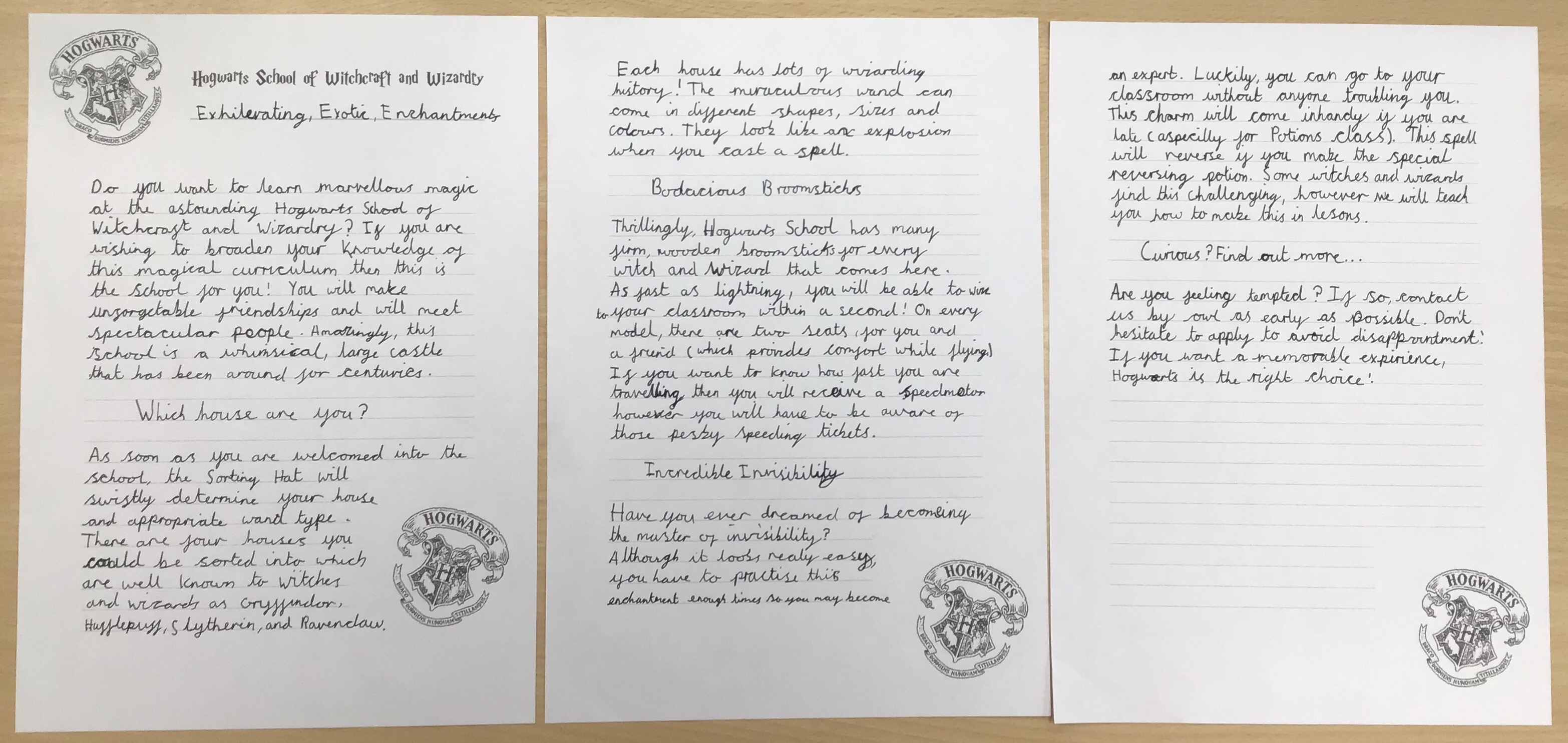 Our literacy this half term has linked closely with our topic. For our first piece, we learnt how to write a persuasive advertisement to try and convince others that Hogwarts is the best school in the country. To do this, we explored how students would feel there and identified which skills and features we would need to include.
