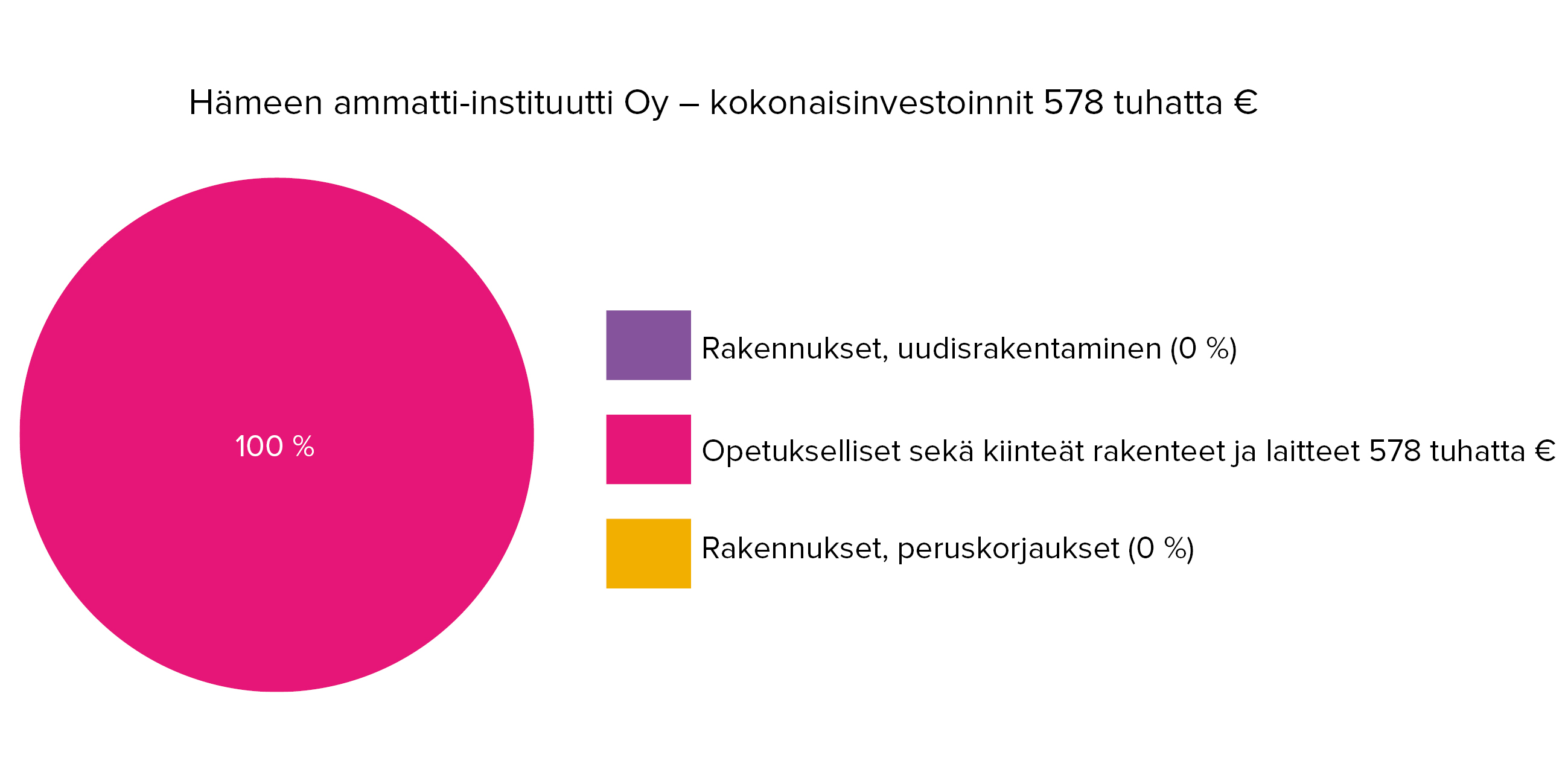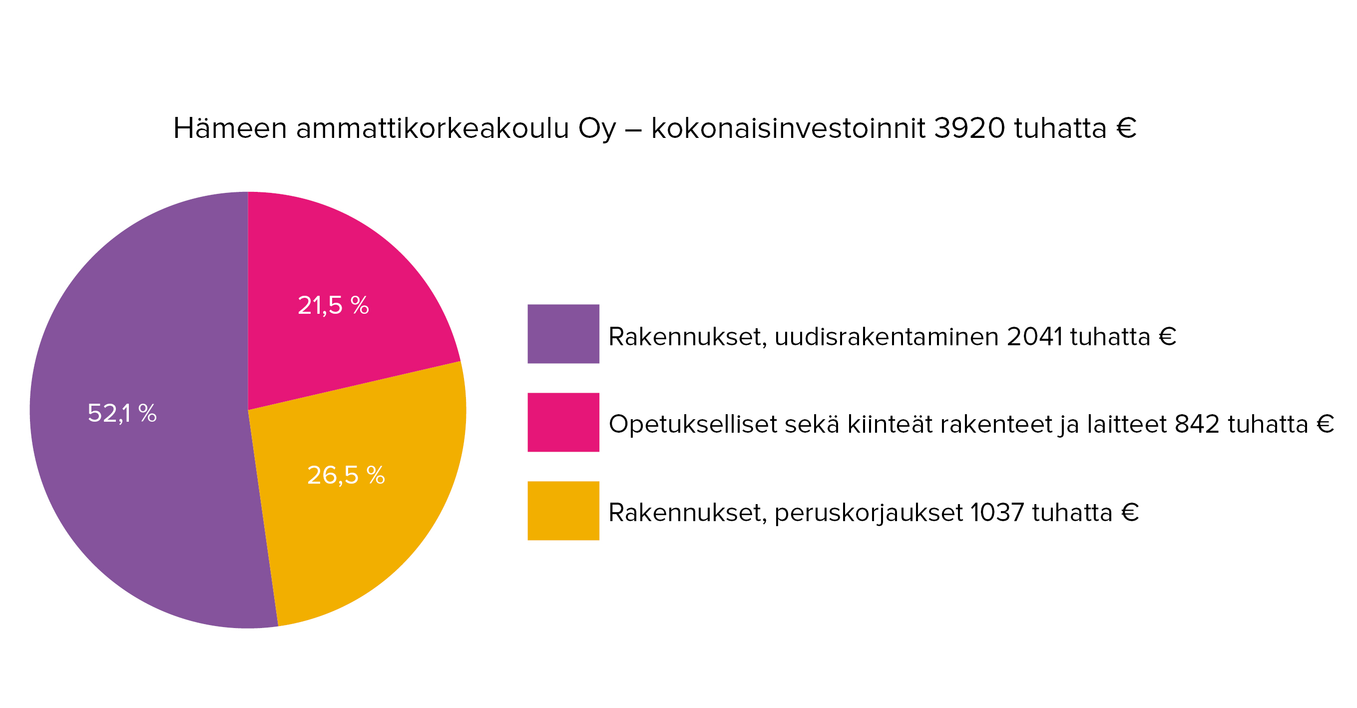 Ammattikorkeakoulun investoinnit olivat 3,9 miljoonaa euroa. Tilikauden aikana valmistuneet merkittävimmät investoinnit olivat Mustialan opetus- ja tutkimusnavetan sekä Ohutlevykeskuksen uuden hallin valmistuminen.