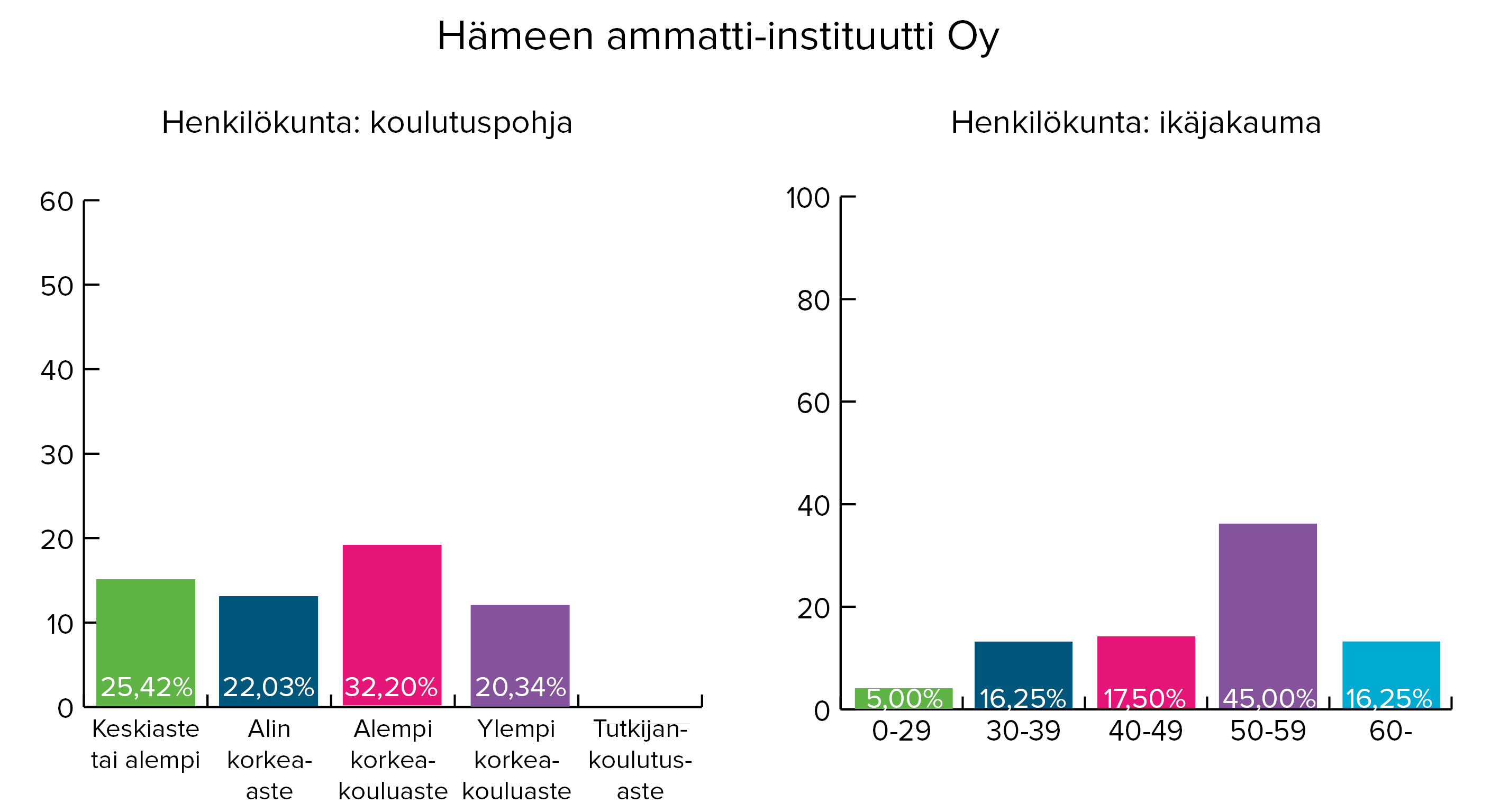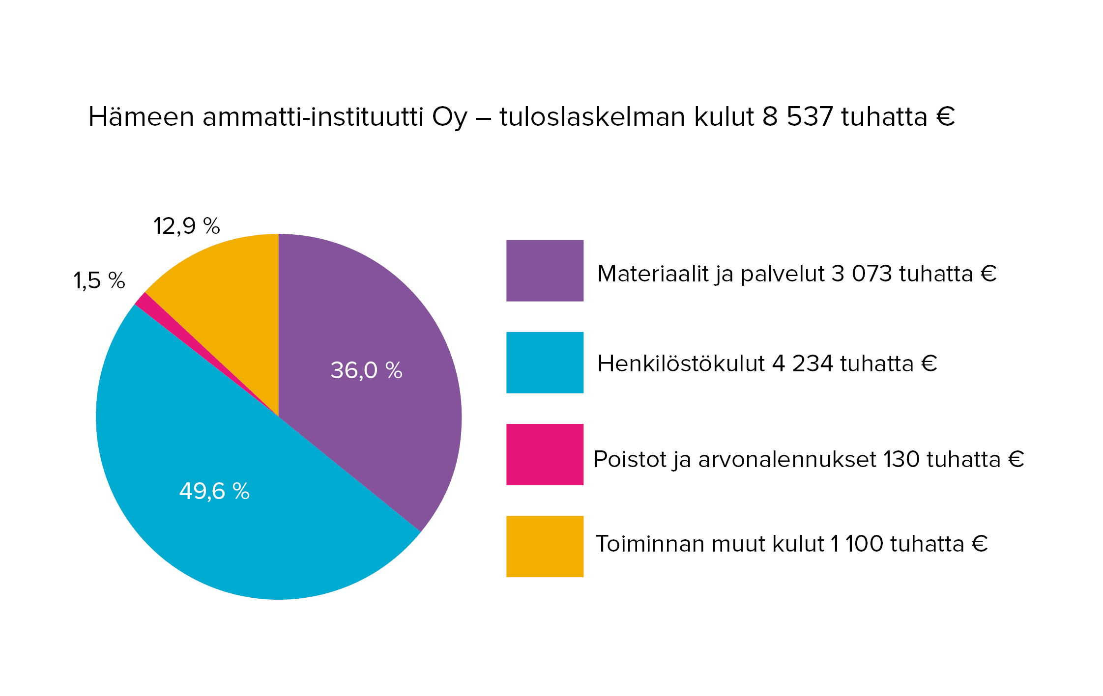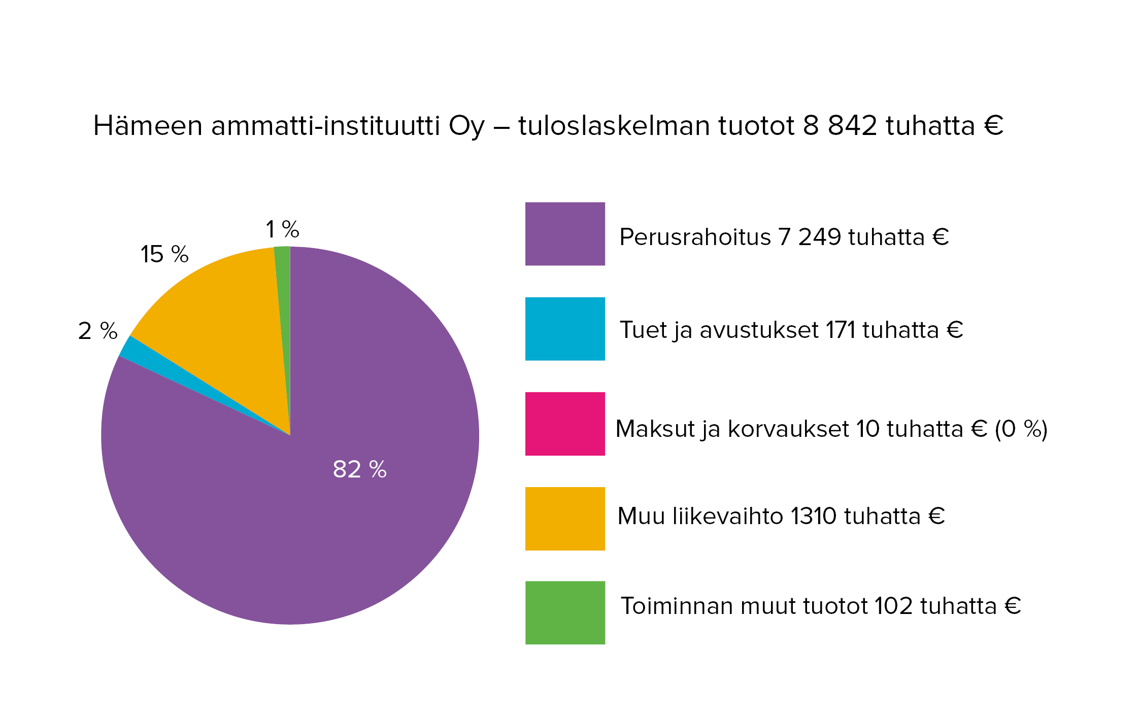 Hämeen ammattikorkeakoulu Oy omistaa Hämeen ammatti-instituutti Oy:n ja nämä muodostavat konsernin. Konsernin liikevaihto oli 57,7 miljoonaa euroa ja tilikauden voitto 50 859,99 euroa.